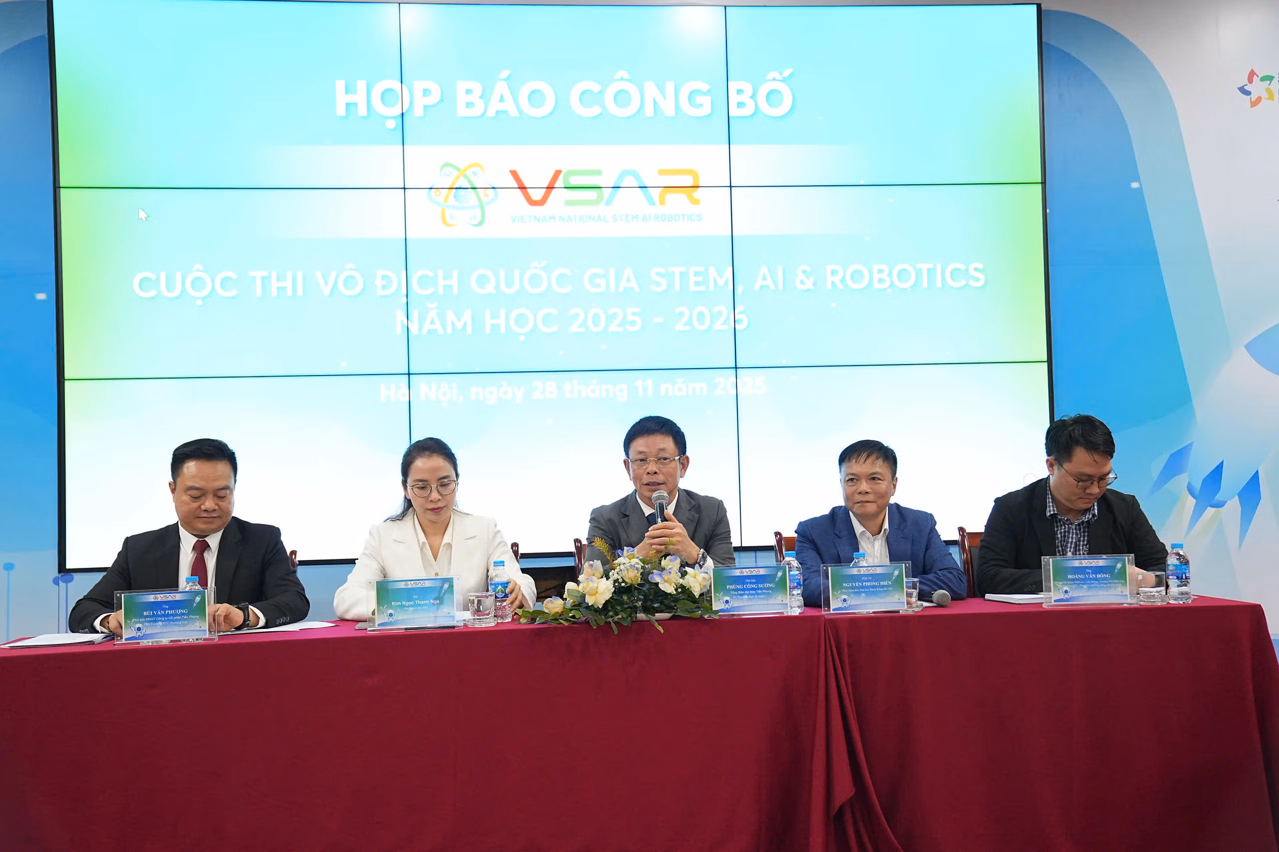 Chiều 28/11, Báo Tiền Phong phối hợp với Hội đồng Đội Trung ương, Trung tâm Đổi mới sáng tạo Quốc gia, Đại học Bách khoa Hà Nội và các đơn vị đồng hành tổ chức họp báo công bố Cuộc thi Vô địch Quốc gia STEM, AI và Robotics (VSAR) năm học 2025-2026.