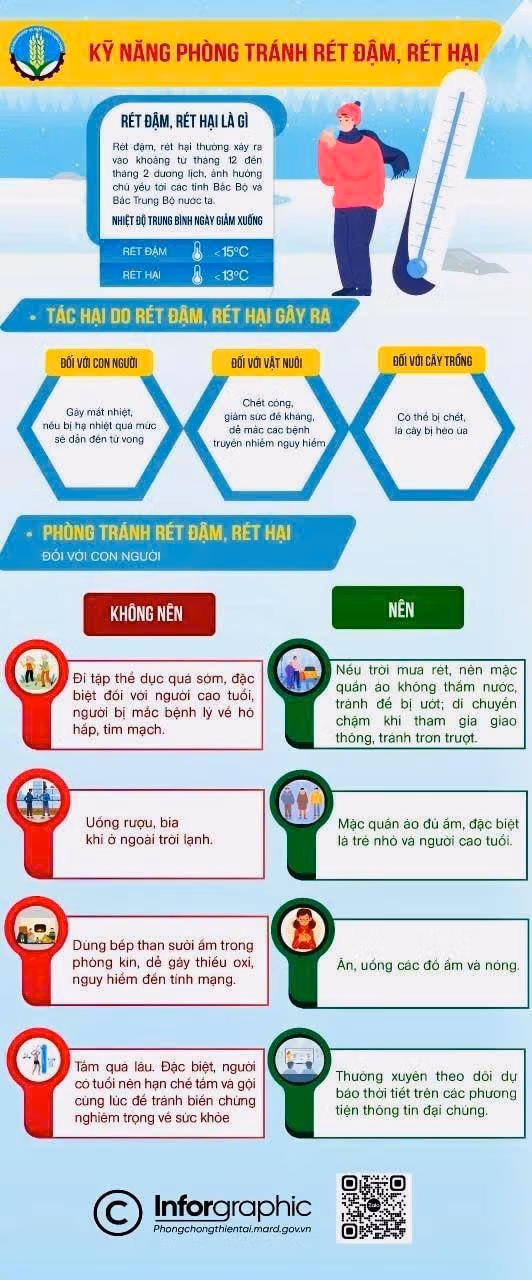 Cục Quản lý đê điều và Phòng, chống thiên tai (Bộ Nông nghiệp và Phát triển nông thôn) đã đưa ra khuyến cáo người dân về một số kỹ năng phòng, chống rét đậm, rét hại như sau: