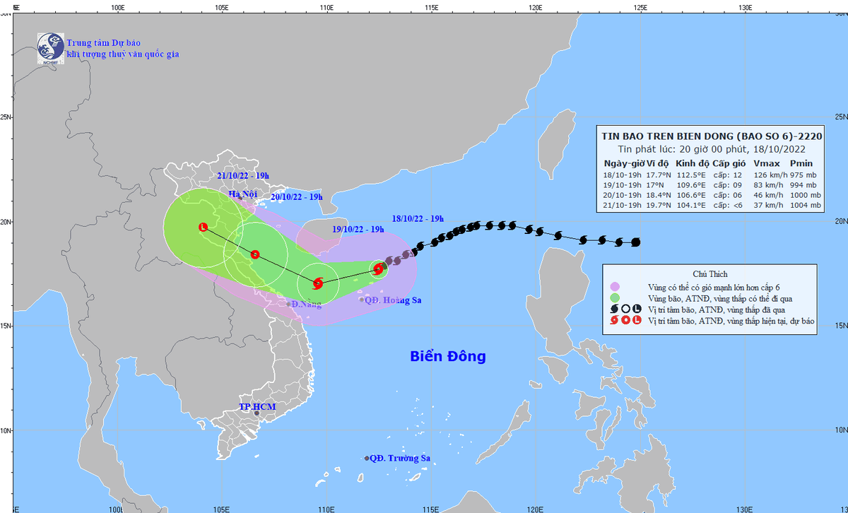 Về hiện trạng bão, Trung tâm cho biết: 19h ngày 18/10, vị trí tâm bão ở vào khoảng 17,7 độ Vĩ Bắc; 112,5 độ Kinh Đông, trên vùng biển phía Bắc quần đảo Hoàng Sa. Sức gió mạnh nhất vùng gần tâm bão mạnh cấp 11 - 12 (103 - 133 km/giờ), giật cấp 14, di chuyển theo hướng Tây Tây Nam với tốc độ 10 - 15 km/h. Dự báo trong 12 giờ tới bão có khả năng suy yếu dần.