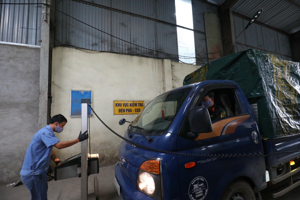 Tương tự, dù đã 11h40 các đăng kiểm viên Trung tâm đăng kiểm 2918D vẫn đang cùng 2 kiểm định viên quân sự khẩn trương thực hiện các thao tác kiểm tra đèn, khí thải cho 2 chiếc xe cuối cùng của ca làm việc buổi sáng.