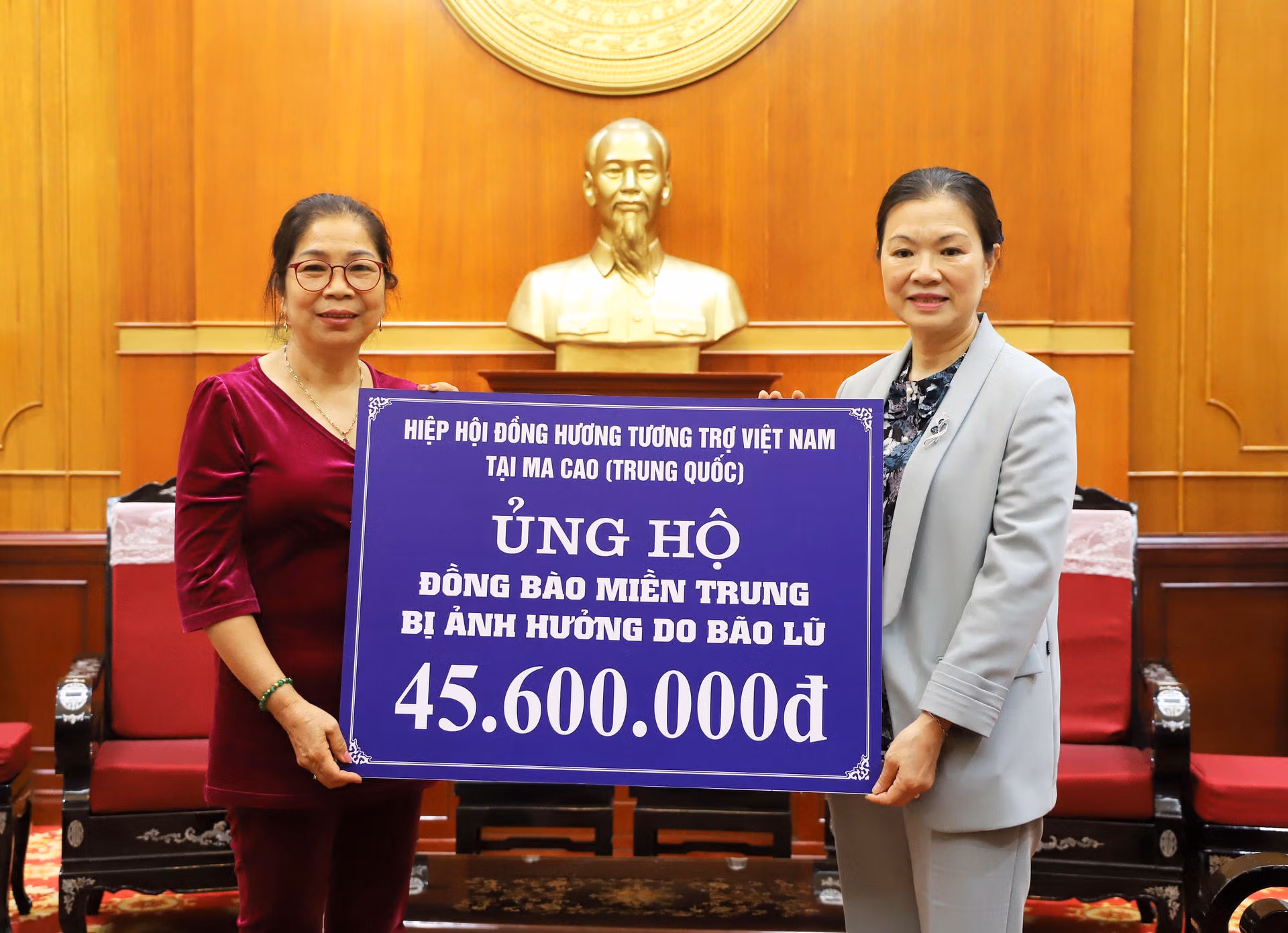 Trao số tiền ủng hộ đến UBTƯ MTTQ Việt Nam, bà Trần Thị Thu, Chủ tịch Hiệp hội Đồng hương tương trợ Việt Nam tại Macau cho biết, Hiệp hội được thành lập từ 2013 với tôn chỉ đồng hương tương thân, tương ái, giúp đỡ lẫn nhau khi hoạn nạn, khó khăn. Ngay từ khi được thành lập, Hiệp hội đã triển khai nhiều hoạt động thiện nguyện, tương trợ người dân Việt Nam, trong đó có hai lần quyên góp gửi về Việt Nam hỗ trợ người dân trong nước phòng, chống dịch Covid-19. Lần này, thông qua UBTƯ MTTQ Việt Nam, Hiệp hội tiếp tục ủng hộ đồng bào miền Trung với mong muốn giúp đỡ bà con sớm vượt qua khó khăn sau bão lũ.