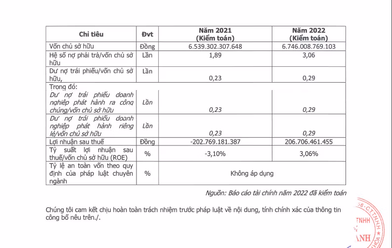 Vốn chủ sở hữu tăng từ mức 6.539,3 tỷ đồng lên 6.746 tỷ đồng. Hệ số nợ phải trả/vốn chủ sở hữu lại tăng đột biến từ 1,89 lần lên tới 3,06 lần; tương ứng, nợ phải trả tính đến cuối năm 2022 lên tới gần 20.643 tỷ đồng.