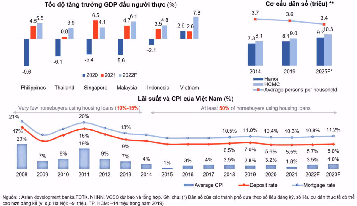 Theo dự báo của các chuyên gia VCSC, lãi suất cho vay thế chấp mua nhà nửa cuối năm nay sẽ cao hơn so với nửa đầu năm. Trong năm 2023, mặt bằng lãi suất cho vay mua nhà sẽ đi ngang, ở mức 11,2%, cao hơn so với dự báo 10,8% ở năm 2022. Còn lãi suất tiền gửi ngân hàng sẽ ở mức 6% trong năm 2023 (dự báo năm 2022 là 5,7%).