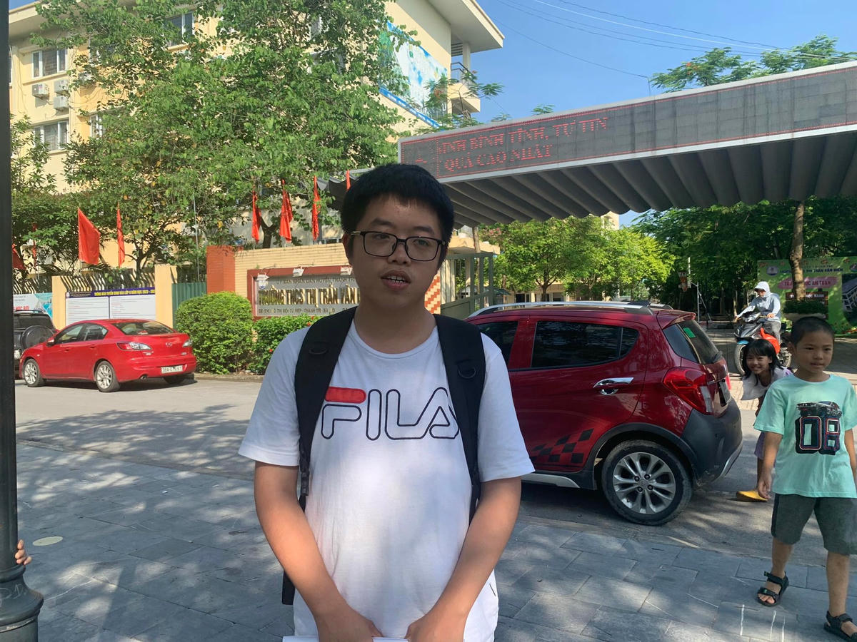 Nguyễn Lê Quang Anh (lớp 12D3, trường THPT Ngọc Hồi, Hà Nội) cho biết em tự tin chắc đúng khoảng 25 câu, còn lại là vừa làm vừa... suy nghĩ. "Thực ra đề không khó, phần đọc hiểu em cũng có thể dịch hiểu gần hết chỉ là không quá chắc chắn về câu trả lời. So với đề thi minh họa, em thấy không khó hơn, cũng không có nhiều từ mới. Tuy nhiên, điểm chính xác thì còn phải chờ so đáp án nhưng với mục tiêu trên trung bình của em đặt ra trước kỳ thi thì chắc sẽ đạt được". Quang Anh hiện đã trúng tuyển theo phương thức xét tuyển sớm vào trường đại học Kinh tế Kỹ thuật Công nghiệp nên em giữ tâm lý thoải mái khi tham gia kỳ thi này.