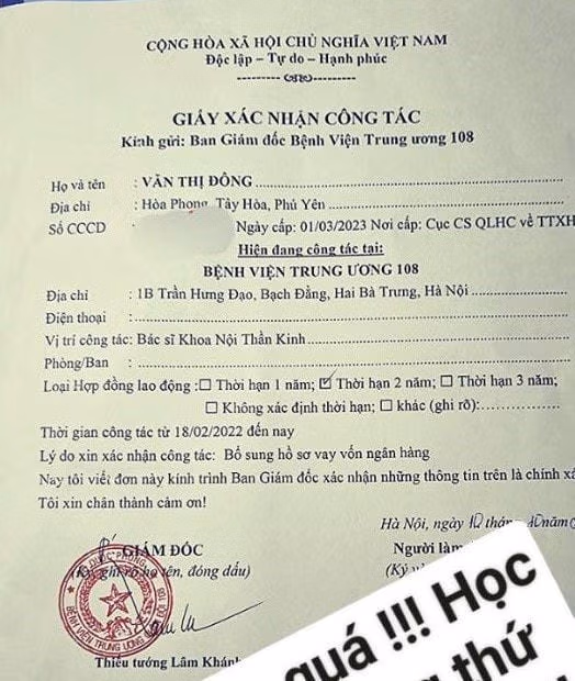Trong văn bản giả “Giấy xác nhận công tác”, đối tượng lừa đảo cắt hình chữ ký, con dấu của Thiếu tướng Lâm Khánh - Phó Giám đốc Bệnh viện TWQĐ 108 gắn vào nội dung tự biên, phần chức danh chưa đúng còn được “chữa cháy” bằng chữ viết tay.