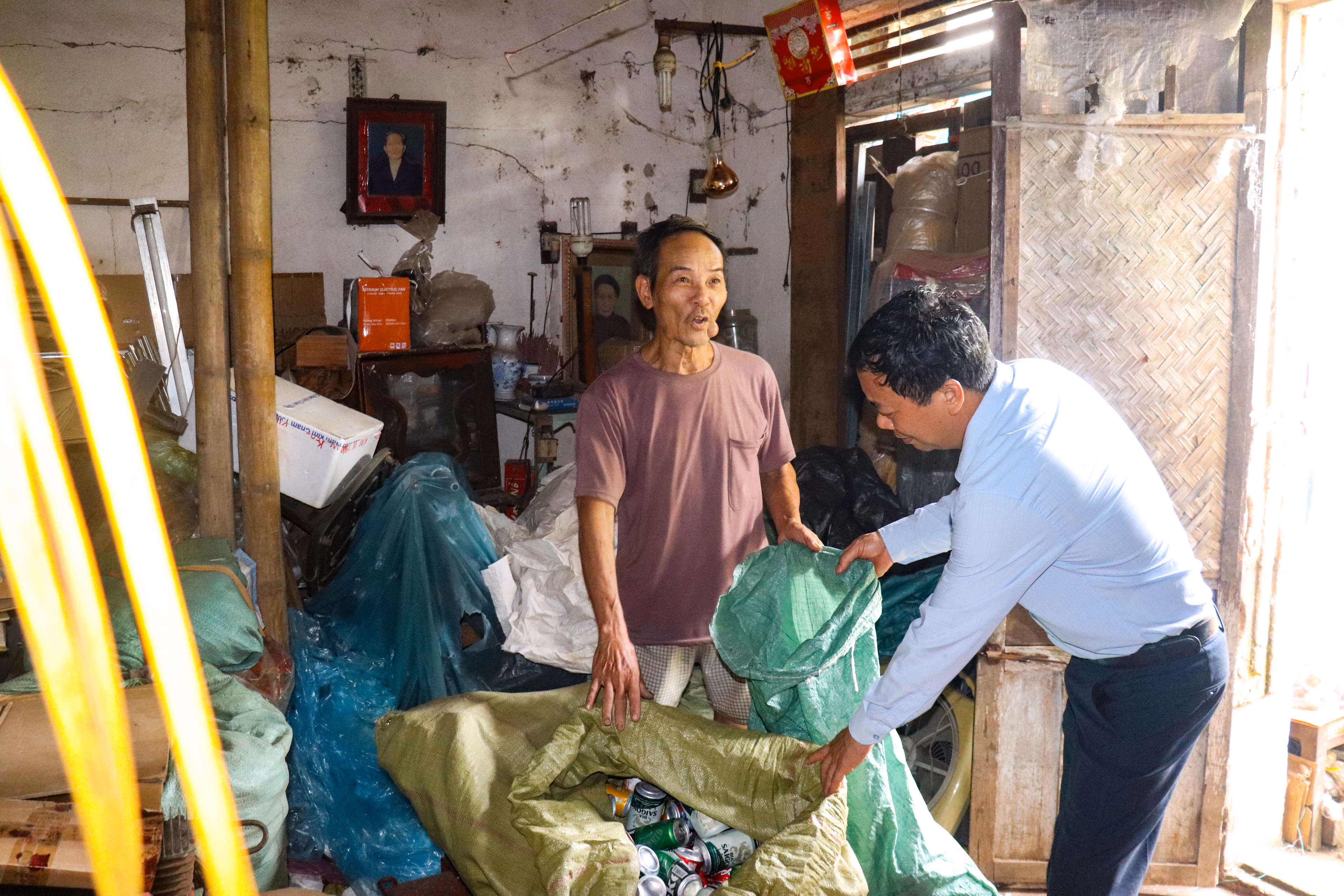 Ở xóm Phát Diệm Nam, ông Phạm Văn Quang sống một mình trong căn nhà tạm bợ, thực chất chỉ là nơi chứa phế liệu. Cuộc sống phụ thuộc vào việc thu gom ve chai khiến thu nhập bấp bênh, không đủ trang trải sinh hoạt chứ chưa nói đến việc sửa chữa nhà cửa. Những vật dụng cũ kỹ, chai lọ, giấy bìa chất đống khắp nơi, tạo nên một không gian sống thiếu an toàn. Vì thế, khi nghe tin sẽ được hỗ trợ xây nhà, ông không giấu được sự xúc động.