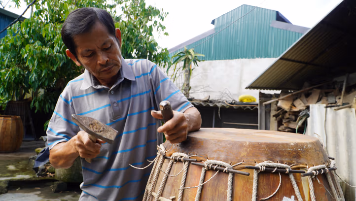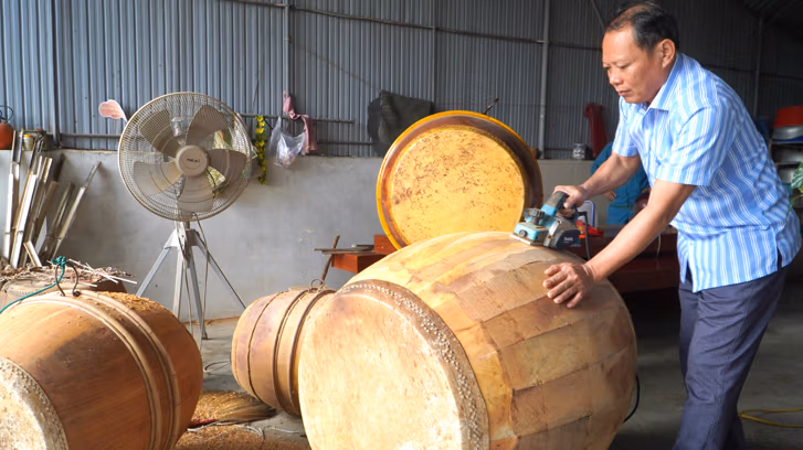 Người thợ phải khéo tay, tỉ mẩn để kéo căng đều miếng da bò vừa dai vừa dày, bịt kín 2 đầu miệng trống, rồi đóng cố định vào thân trống bằng đinh chốt làm từ tre già. Đây là bước điều chỉnh âm thanh cao thấp nên chỉ có những người “rành” nghề mới có thể xử lý được bài bản, đạt chuẩn. Chính kỹ thuật khéo léo, tỉ mỉ đã tạo nên sự khác biệt cho từng chiếc trống của làng nghề.