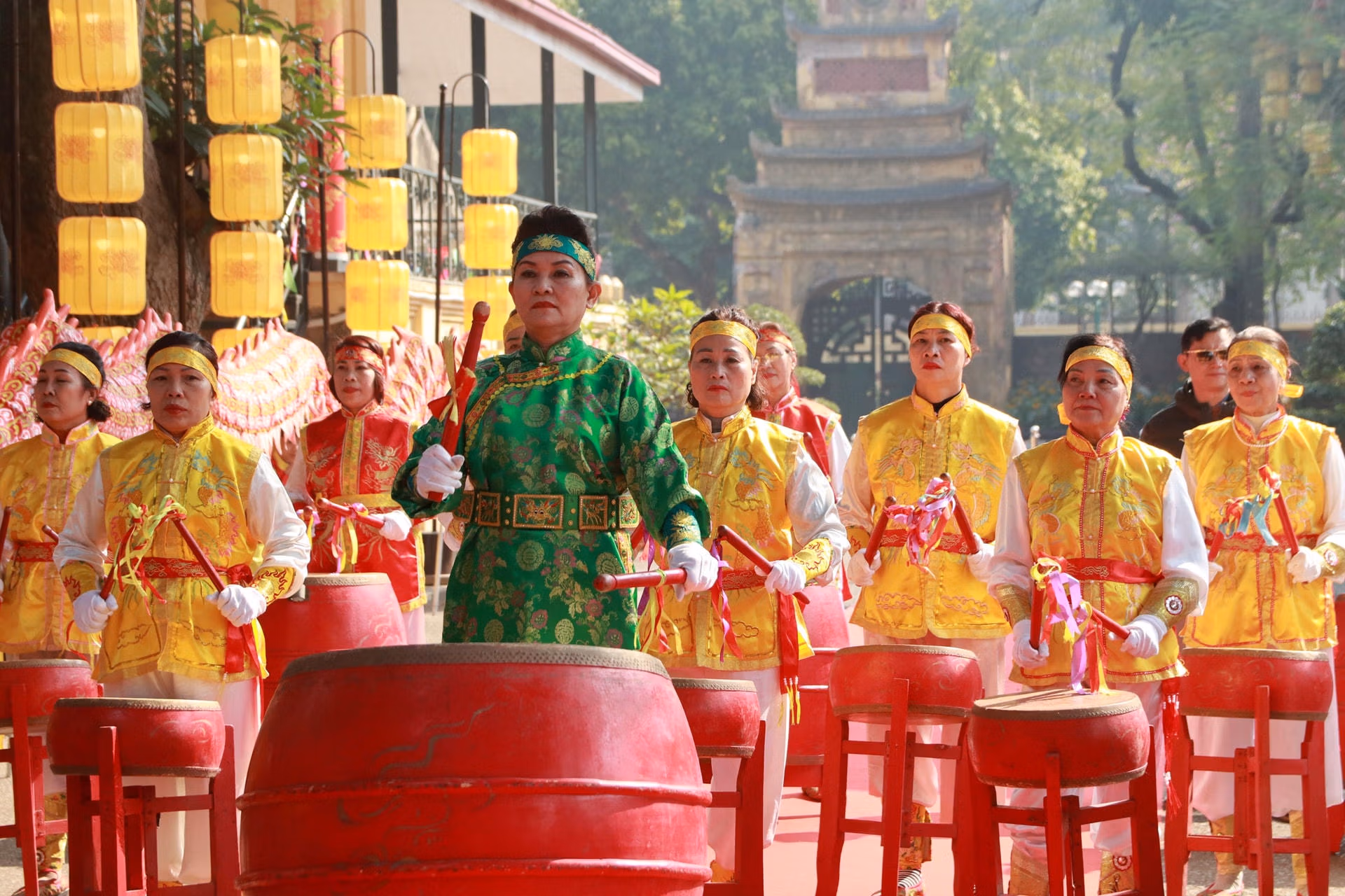 Tiếp đến là màn biểu diễn Trống hội Thăng Long của các nghệ nhân làng Hạ Yên Quyết, thể hiện khí phách hào hùng của Thăng Long - Hà Nội ngàn năm văn hiến. Đoàn rước có sự tham gia của nhiều Hội viên được tập kết tại Sân Đoan Môn và tiến vào sân Rồng điện Kính Thiên theo đúng nghi thức truyền thống.