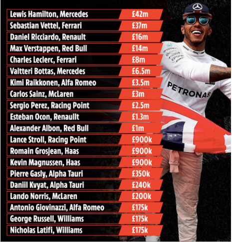 Dĩ nhiên, thu nhập giữa người đứng đầu và các vị trí tiếp theo cũng có sự cách biệt rất lớn. Dù vậy, với tầm ảnh hưởng cộng với các danh hiệu thi đấu, Lewis Hamilton hoàn toàn xứng đáng với khoản thu nhập kếch xù mà anh đang được nhận.