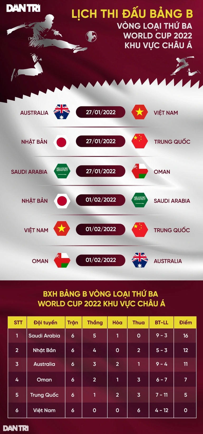 Lịch thi đấu bảng B vòng loại thứ 3 World Cup Thứ Sáu 07/01/2022 10:57 (GMT+7) Lịch thi đấu bảng B vòng loại thứ 3 World Cup, Việt Nam lần lượt gặp Australia (27/1) và Trung Quốc (1/2). Nguồn: Dân Trí. B.Phúc (tổng hợp)