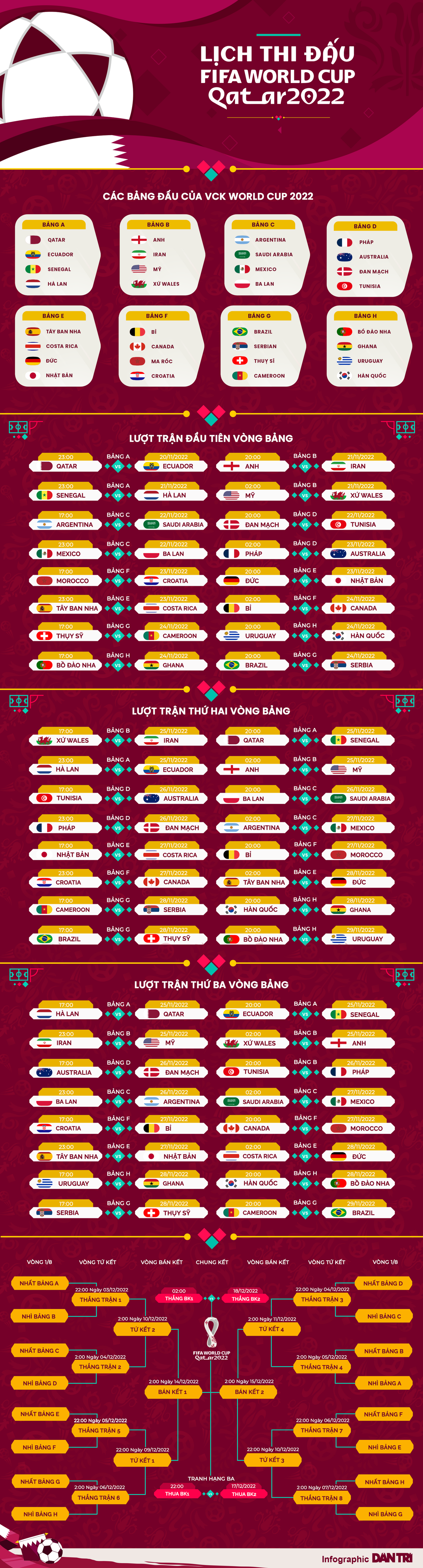 Lịch thi đấu chính thức World Cup 2022 Thứ Ba 11/10/2022 07:47 (GMT+7) World Cup 2022 sẽ diễn ra tại Qatar từ 21/11 đến 18/12 với 64 trận đấu so tài đầy hấp dẫn. Brazil, Argentina, Đức, Pháp, Tây Ban Nha được đánh giá là những ứng cử viên hàng đầu cho chức vô địch.