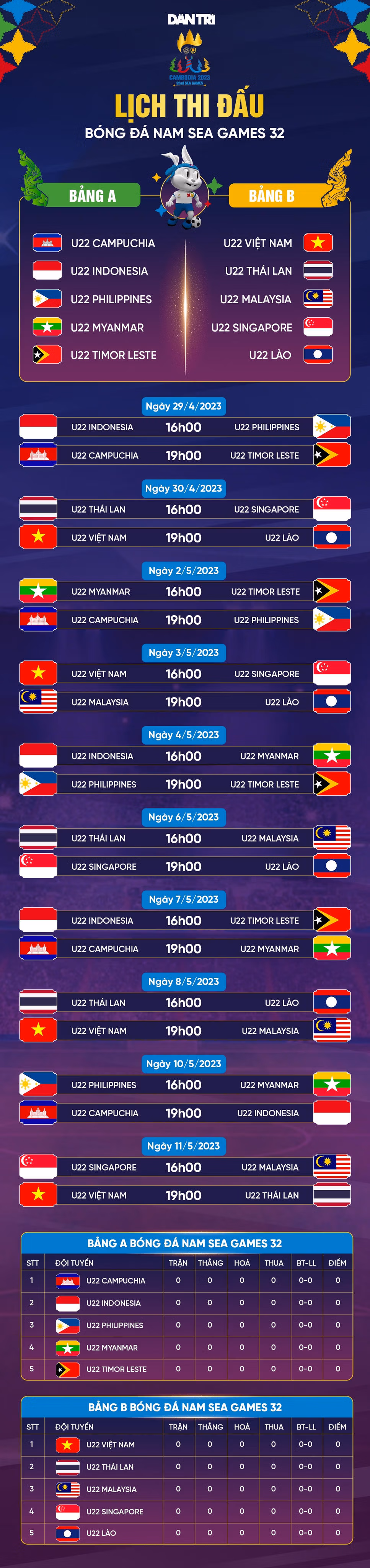 Lịch thi đấu môn bóng đá nam SEA Games 32 Thứ Bảy 08/04/2023 15:11 (GMT+7) Ở SEA Games 32, U22 Việt Nam nằm ở bảng B cùng với các đối thủ Thái Lan, Malaysia, Singapore và Lào. Mục tiêu của đoàn quân HLV Troussier là bảo vệ tấm HCV khu vực Đông Nam Á.