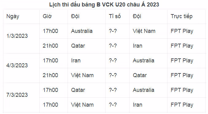 Trận đấu mở màn của U20 Việt Nam gặp U20 Australia trong khuôn khổ bảng B VCK U20 châu Á 2023 sẽ diễn ra vào 17h giờ Việt Nam ngày 1/3 trên SVĐ Istiqlol (thành phố Fergana, Uzbekistan). ĐT U20 Việt Nam do HLV Hoàng Anh Tuấn dẫn dắt sẽ ra sân trong trang phục màu đỏ.