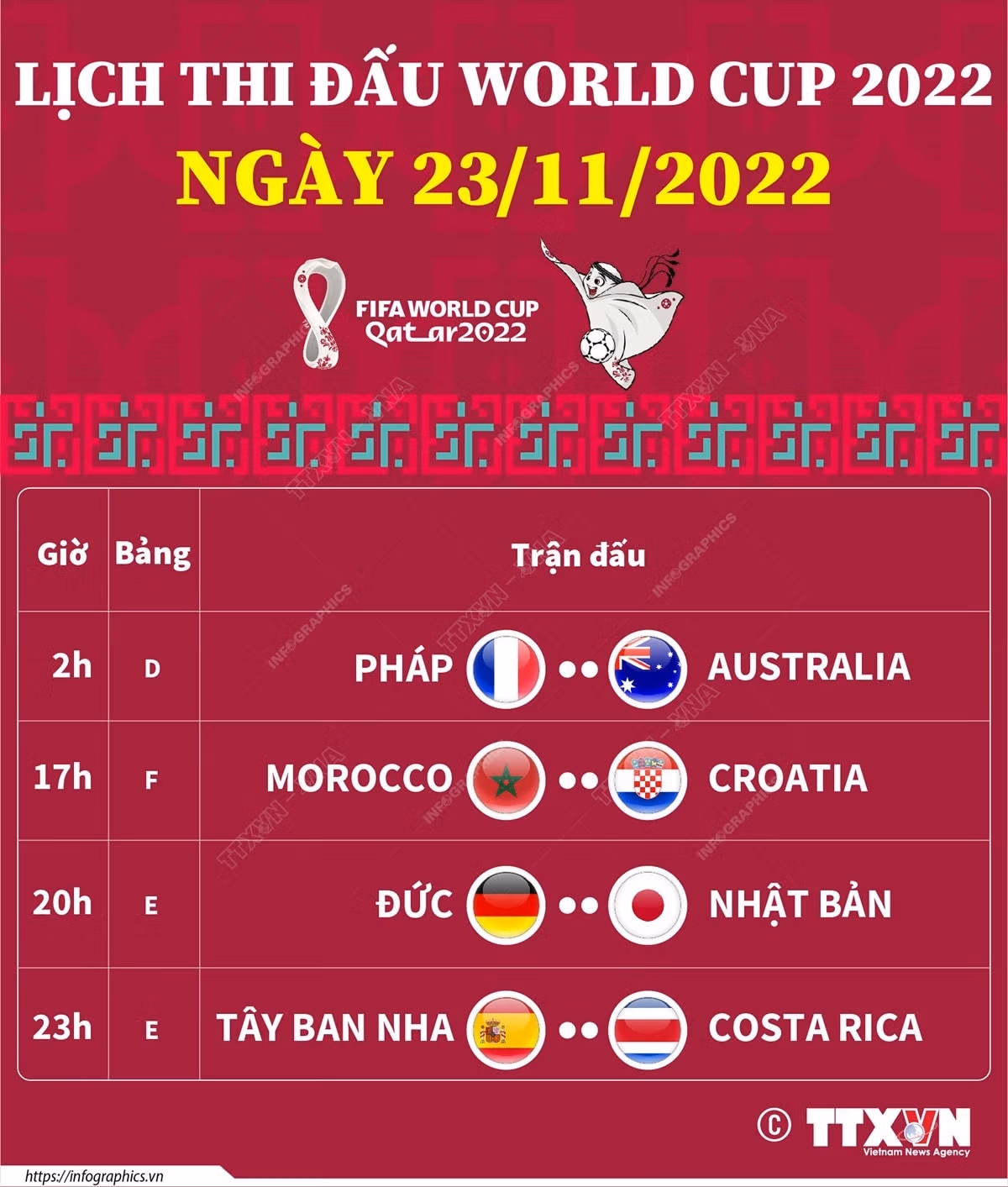 Lịch thi đấu World Cup 2022 ngày 23/11/2022 Thứ Tư 23/11/2022 11:12 (GMT+7) Ngày 23/11/2022, vòng bảng World Cup 2022 diễn ra 4 trận đấu ở các bảng D, E và F.