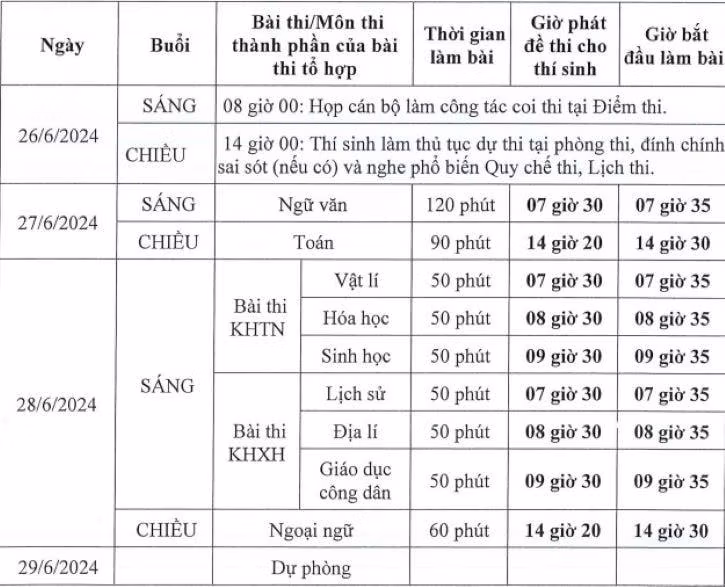 Cụ thể, ngày 26/6: làm thủ tục dự thi; ngày 27,28/6/2024: tổ chức coi thi; ngày 29/6/2024: dự phòng.