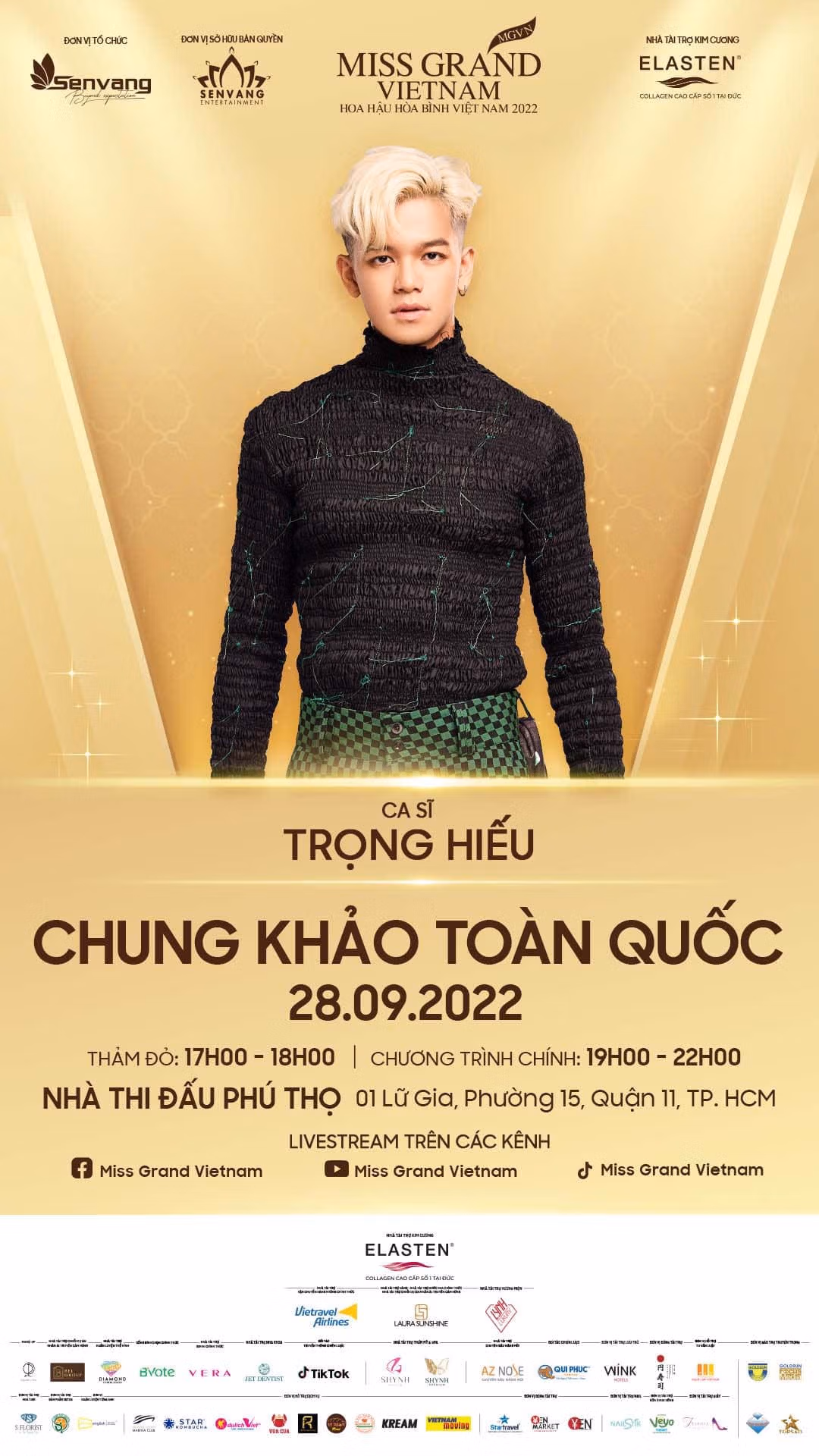 Chung khảo Miss Grand Vietnam 2022 sẽ chính thức diễn ra ngày 28/09 và đêm thi chung kết vào ngày 1/10 tại nhà thi đấu Phú Thọ (TP HCM). Đêm thi sẽ được phát trực tiếp trên Youtube, Facebook và TikTok của Miss Grand Vietnam 2022.