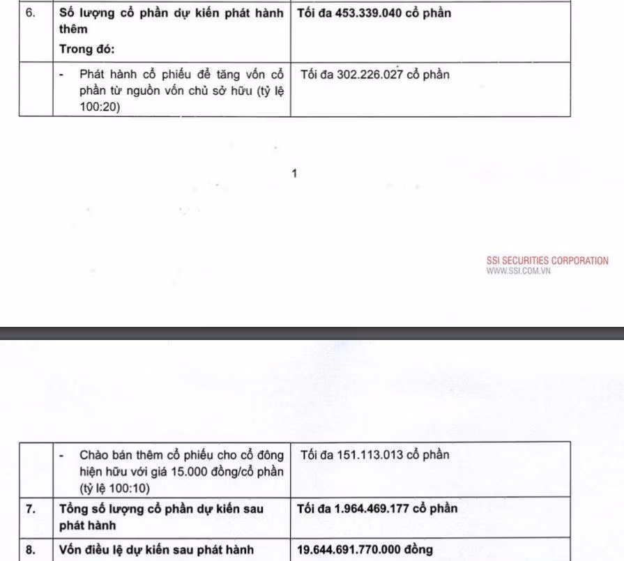 Tổng cộng SSI sẽ phát hành thêm hơn 453,3 triệu cổ phiếu mới. Thời gian dự kiến phát hành là năm 2023-2024 hoặc thời hạn khác theo quyết định của HĐQT.