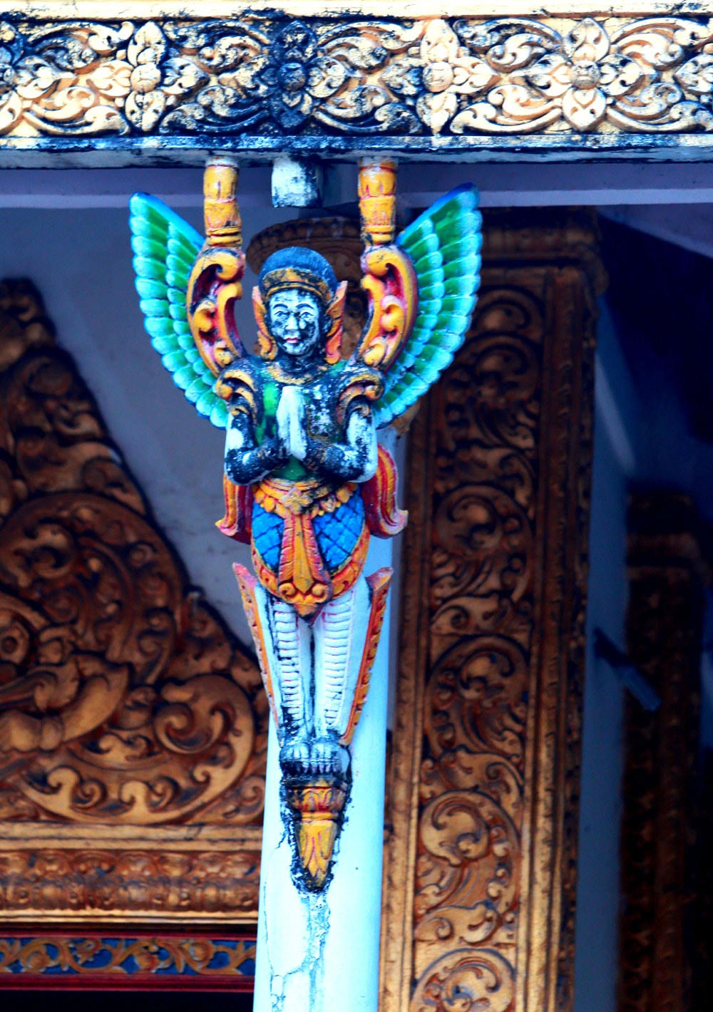 Ở những ngôi chùa Khmer Nam Bộ, việc điêu khắc, trang trí được chú trọng và được dùng khắp mọi chỗ như góc mái, cột, diềm mái... Ở mặt tường ngoài và các cột của chánh điện được đắp nổi đắp nổi, tượng tròn hoặc chạm khắc, thể hiện các hình tượng Reahu (Hổ phù), Tiên nữ, chim thần Kâyno, Chằn (Yeak)... Đặc biệt nhất trong những hình tượng này là mô típ trang trí Reahu và mô típ Chằn. Reahu được thể hiện là mặt một quái vật hung dữ với đôi mắt trợn trừng, đe dọa, vành miệng rộng, nhe hai hàm răng nhọn lởm chởm, đang nuốt mặt trăng. Reahu được trang trí ở nhiều nơi như trên cổng vào chùa, trên vòm mặt tiền ngôi chính điện, trên vòm cửa ra vào và thậm chí ở ngay cả bệ tượng Phật. Mô típ Chằn cũng là đại biểu lực lượng tà, phá hoại Phật Pháp. Chằn được thể hiện dưới dạng một người to lớn, khoẻ mạnh, vẻ mặt dữ tợn, mình mặc giáp trụ, tay cầm chày vồ đứng gác ở cổng chùa.