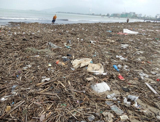 Rác ngập bờ biển Đà Nẵng sau bão 13.