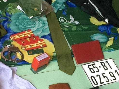 Khám xét nhanh nơi ở của Nguyễn Thái Sơn, cơ quan chức năng phát hiện và thu giữ 1 bộ ve hàm, cầu vai hàm đại tá; 1 biển tên CAND “Nguyễn Thái Sơn, chức vụ: Phó Trưởng phòng, số hiệu Công an nhân dân 372 - 808”; 1 dấu tên mực đỏ “Nguyễn Thái Sơn - Phó Trưởng phòng Điều tra Hình sự”; 1 khóa số 8 và biển số xe mô tô 65B1 - 025.91 (biển trắng).