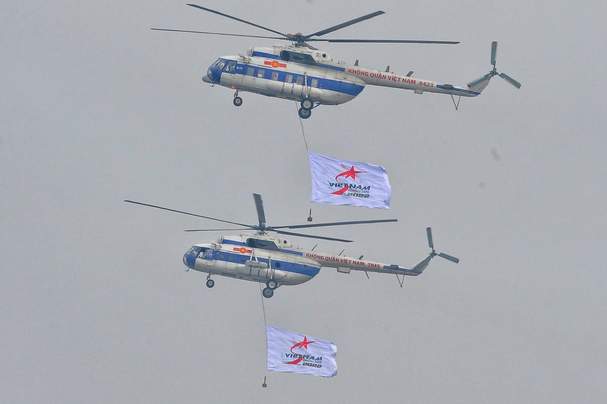 Sáng 8/12, sau lễ khai mạc Triển lãm Quốc phòng quốc tế Việt Nam 2022 là màn trình diễn của phi đội Su-30MK2 (8 chiếc) và trực thăng dòng Mi (6 chiếc) tại khu vực khán đài lễ khạc mạc tại sân golf Long Biên.Bay khai mạc triển lãm là đội bay gồm 6 trực thăng họ Mi. Biên đội bay đầu tiên tiến vào khán đài là các trực thăng dòng Mi thuộc Trung đoàn không quân 916 cùng cờ Tổ quốc và cờ hiệu Triển lãm Quốc phòng quốc tế Việt Nam 2022. Mỗi trực thăng mang theo cờ Tổ quốc và cờ triển lãm. Mỗi lá cờ diện tích 20 m2, với kích thước 5,4 m x 3,6 m. Khoảng 8 giờ 30 sáng, các trực thăng gồm Mi 171, 172 và Mi 17 treo dưới bụng 1 quả nặng có trọng lượng lên tới 125 kg bay trên bầu trời Hà Nội.Sau khi bay qua khán đài, biên đội 4 chiếc Su-30MK2 đầu tiên trình diễn bay trên không khi tách thành hai tốp.Màn trình diễn của Su-30MK2 thả bẫy mồi nhiệt.Tốp bay bên trái lượn 3 vòng liên tục trên bầu trời Hà Nội và bay thả mồi bẫy nhiệt ở vòng bay thứ ba, kết thúc màn trình diễn trên không.