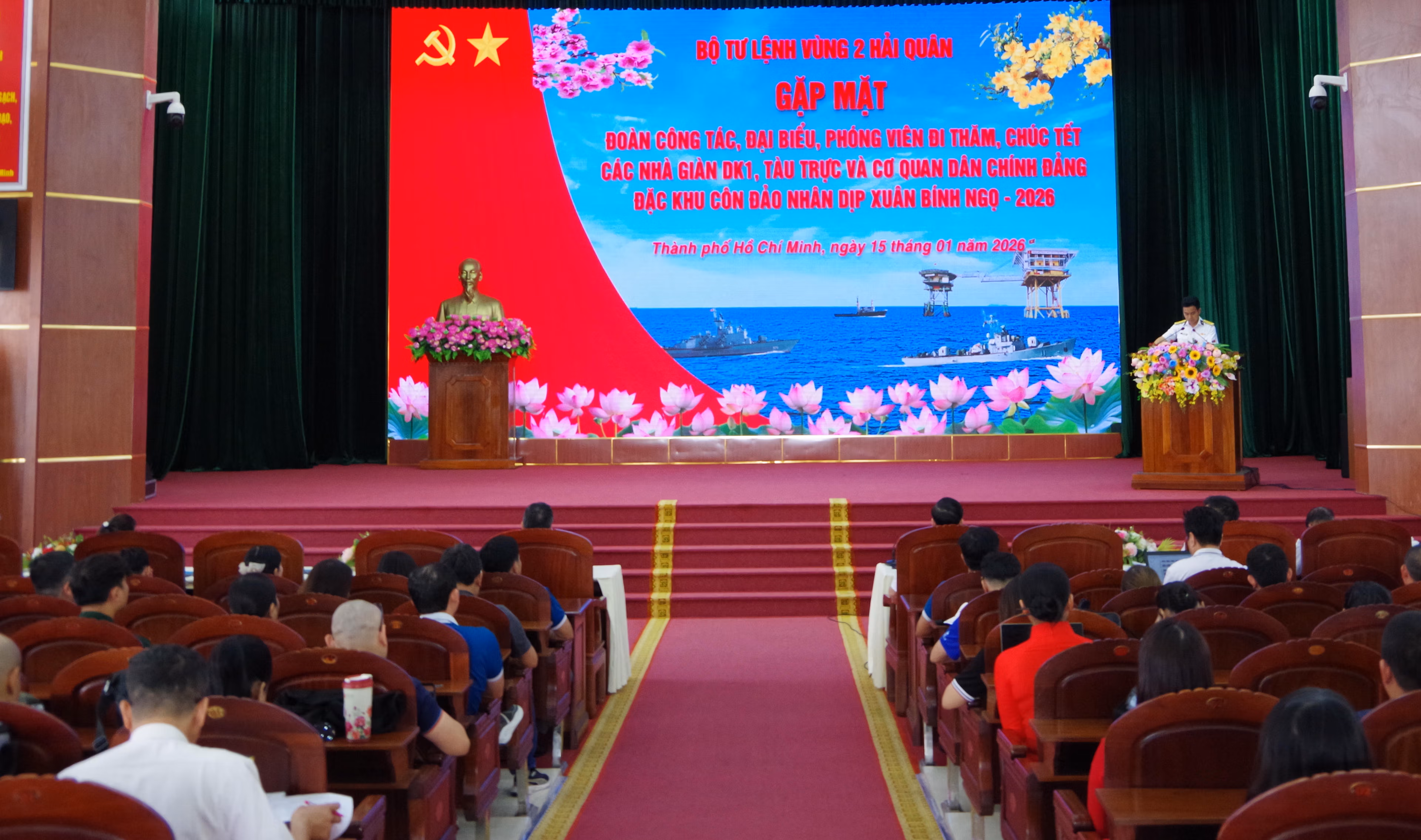 Ngày 15/1, trong không khí những ngày giáp Tết Nguyên đán Bính Ngọ 2026, tại xã Long Sơn (TP Hồ Chí Minh), Bộ Tư lệnh (BTL) Vùng 2 Hải quân đã tổ chức gặp mặt đoàn công tác, các đại biểu và phóng viên báo chí lên đường thực hiện nhiệm vụ tuyên truyền, thăm, chúc Tết cán bộ, chiến sĩ tại các nhà giàn DK1, tàu trực và đặc khu Côn Đảo.