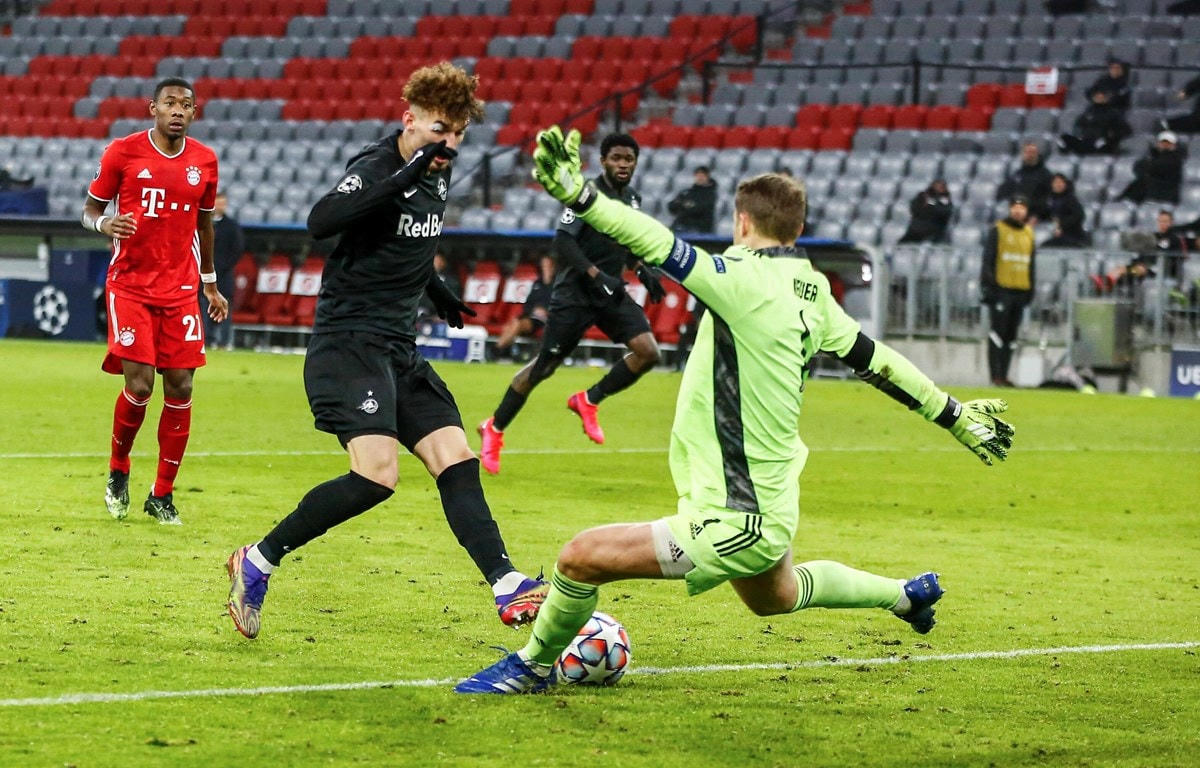 Neuer dường như trở thành "nỗi ám ảnh" với hàng công của Salzburg. Anh xuất sắc cản phá cú sút của Mergim Berisha trong pha đối mặt ở phút 15, và khiến Dominik Szoboszlai hoảng hốt dứt điểm vọt xà cũng ở tư thế tương tự sau đó 20 phút.
