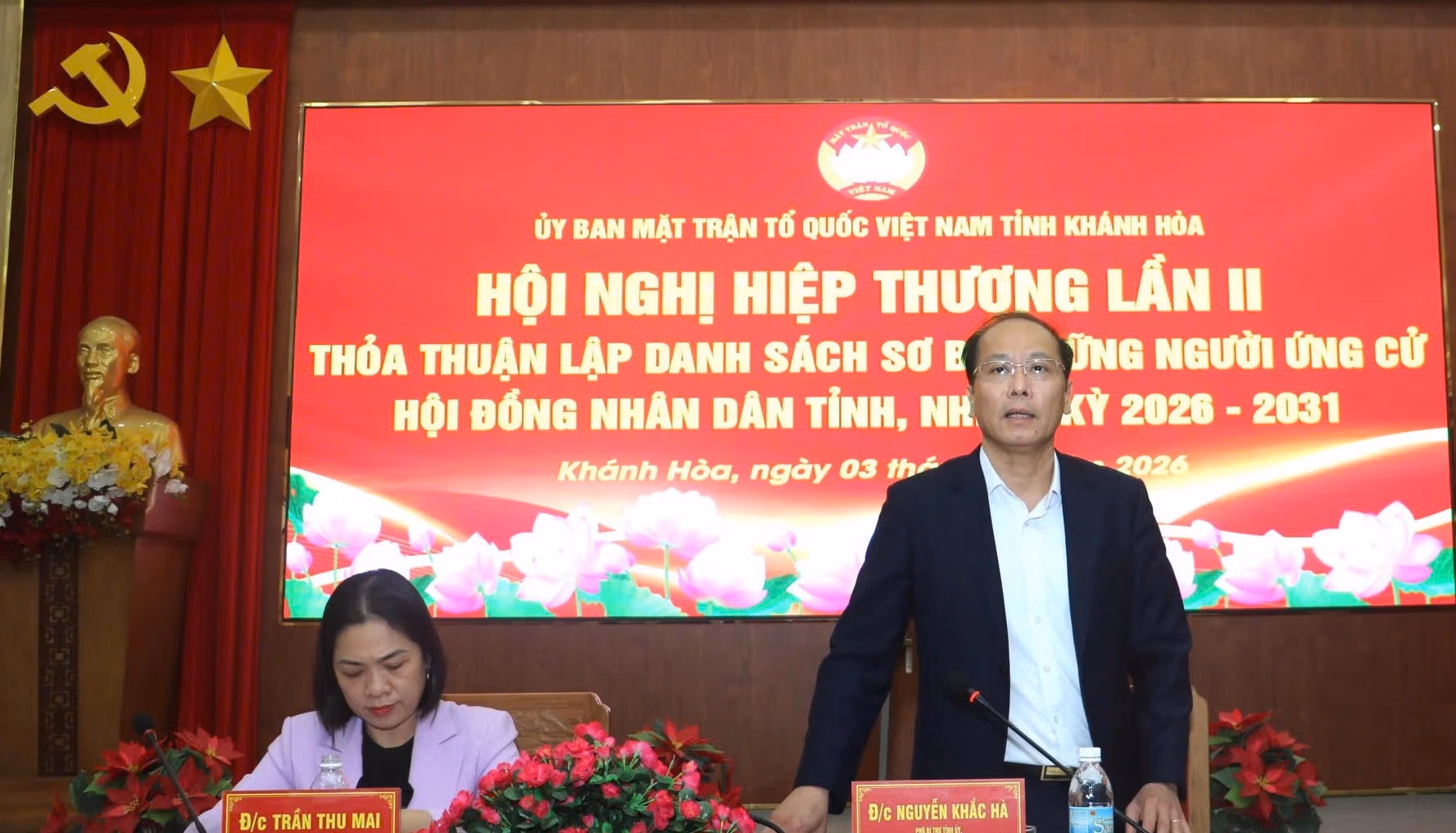 Ông Nguyễn Khắc Hà, Phó Bí thư Tỉnh ủy, Chủ tịch Ủy ban MTTQ Việt Nam tỉnh Khánh Hòa; bà Trần Thu Mai, Ủy viên Ban Thường vụ Tỉnh ủy, Phó Chủ tịch Thường trực Ủy ban MTTQ Việt Nam tỉnh Khánh Hòa chủ trì Hội.