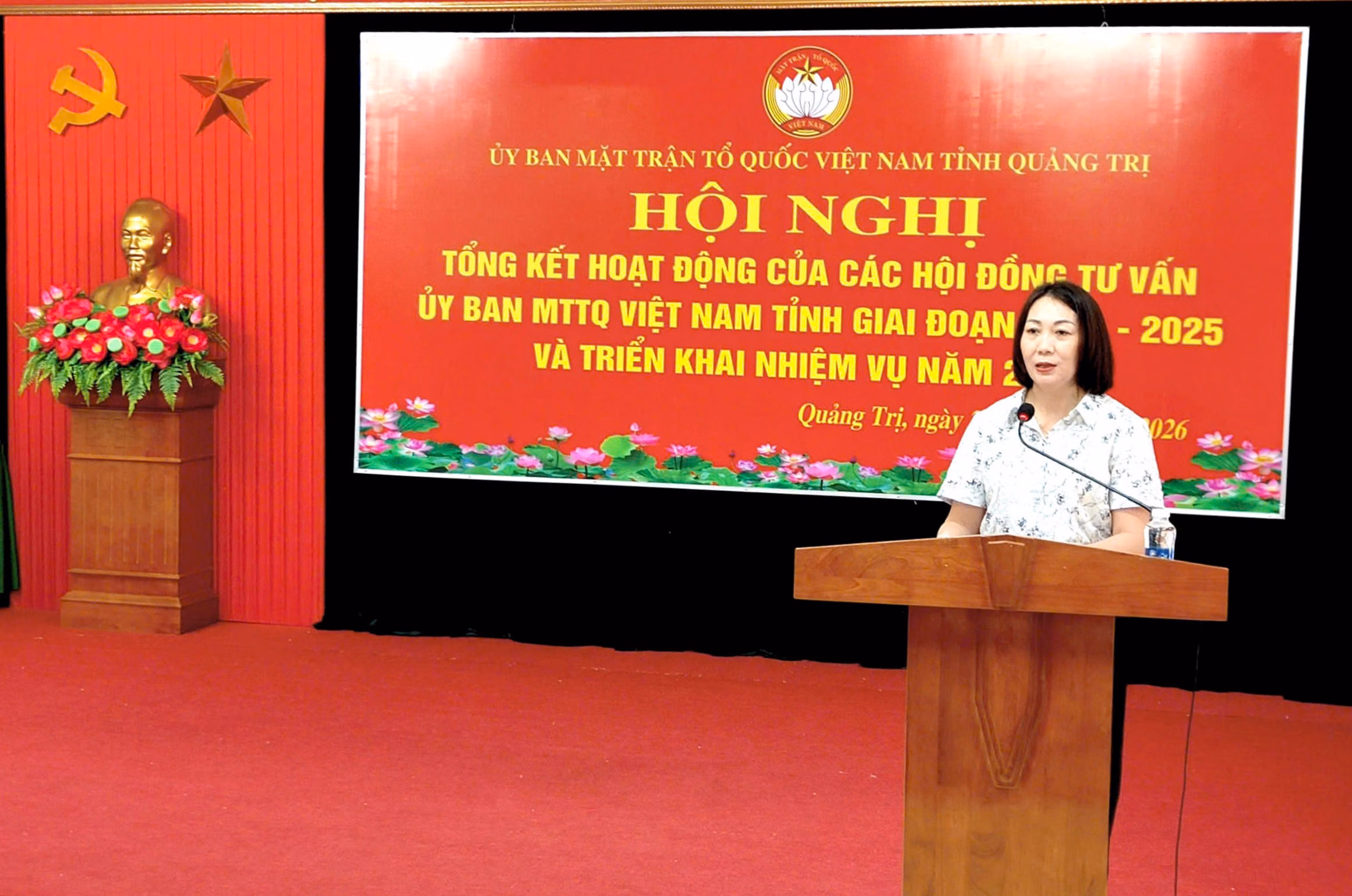 Tại hội nghị, các đại biểu được nghe báo cáo tổng kết hoạt động các Hội đồng tư vấn của Ủy ban MTTQ Việt Nam tỉnh giai đoạn 2024 - 2025 và triển khai nhiệm vụ năm 2026.