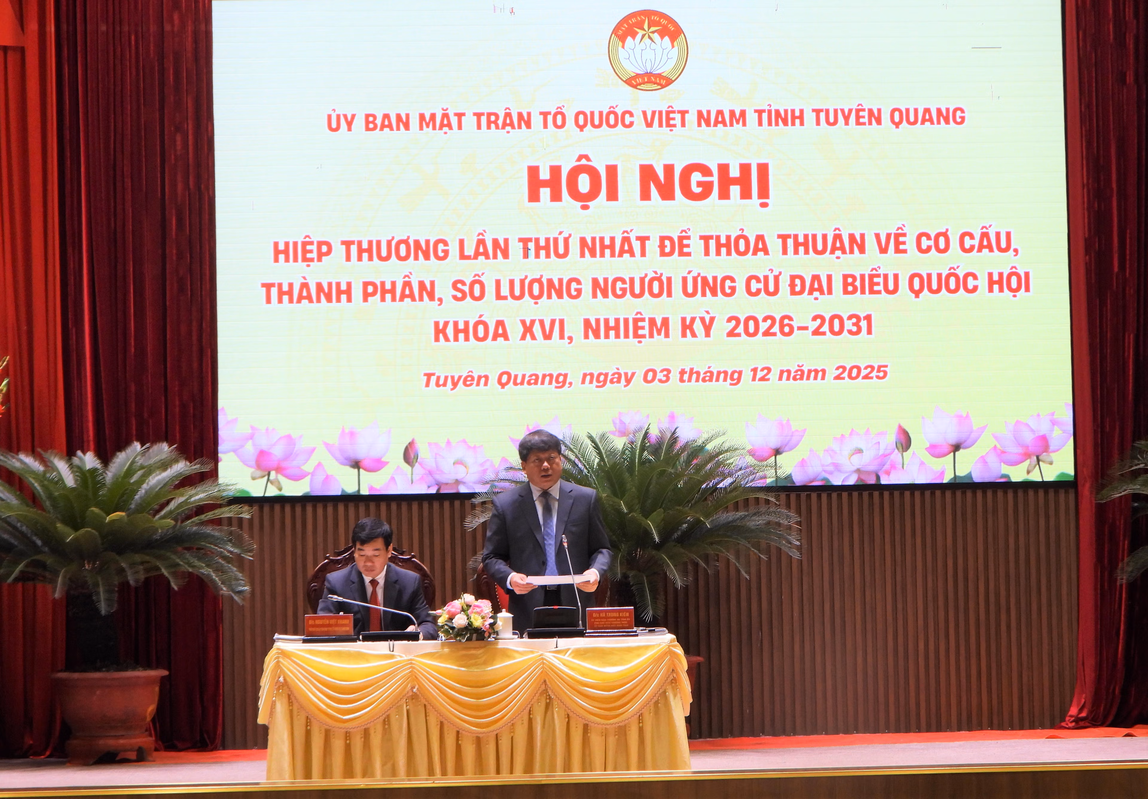 Tại nội dung Hiệp thương thỏa thuận về cơ cấu, thành phần, số lượng người ứng cử đại biểu HĐND tỉnh Tuyên Quang khóa XX, nhiệm kỳ 2026 - 2031, ông Hầu Minh Lợi, Ủy viên Ban Thường vụ Tỉnh ủy, Phó Chủ tịch Thường trực HĐND tỉnh Tuyên Quang trình bày dự kiến số lượng đại biểu HĐND tỉnh là 62 đại biểu. Về cơ cấu gồm: Đại biểu nữ, người dân tộc thiểu số, trẻ tuổi, tái cử, đại biểu ngoài Đảng. Số người được giới thiệu ứng cử là 101 người.