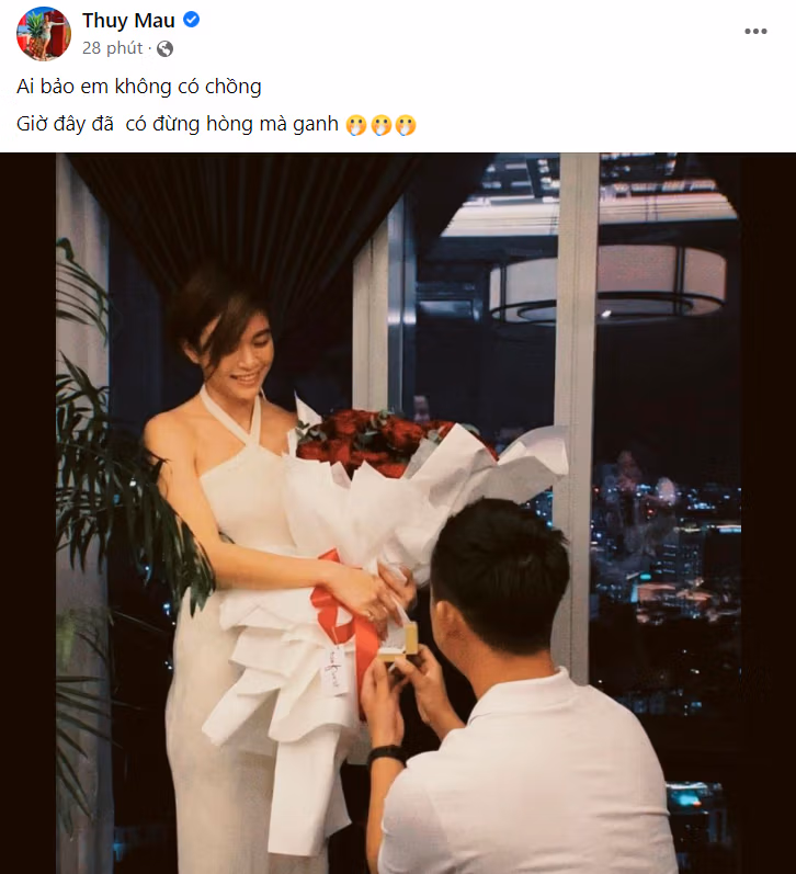 Chiều ngày 31/07, siêu mẫu Mâu Thủy đăng tải bài viết thông báo được bạn trai cầu hôn. “Ai bảo em không có chồng. Giờ đây đã có đừng hòng mà ganh”, Mâu Thủy hạnh phúc chia sẻ. Cô cũng đăng kèm tấm ảnh tay ôm bó hoa, miệng cười rạng rỡ khi được bạn trai quỳ gối cầu hôn.