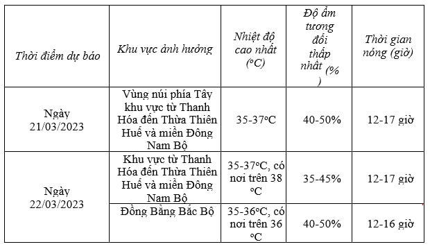Dự báo diễn biến nắng nóng, Trung tâm cho biết: Ngày 21/3, khu vực vùng núi phía Tây từ Thanh Hóa đến Thừa Thiên Huế có nắng nóng. Ngày 22/3, khu vực đồng bằng Bắc Bộ, các tỉnh Sơn La, Hòa Bình và khu vực từ Thanh Hóa đến Thừa Thiên Huế có khả năng xảy ra nắng nóng diện rộng với nhiệt độ cao nhất phổ biến 35-37 độ có nơi trên 37 độ, độ ẩm tương đối thấp nhất 35-50%; các nơi khác ở Bắc Bộ và khu vực từ Đà Nẵng đến Phú Yên có khả năng xảy ra nắng nóng cục bộ với nhiệt độ cao nhất phổ biến 34-36 độ, có nơi trên 36 độ, độ ẩm tương đối thấp nhất 45-55%.