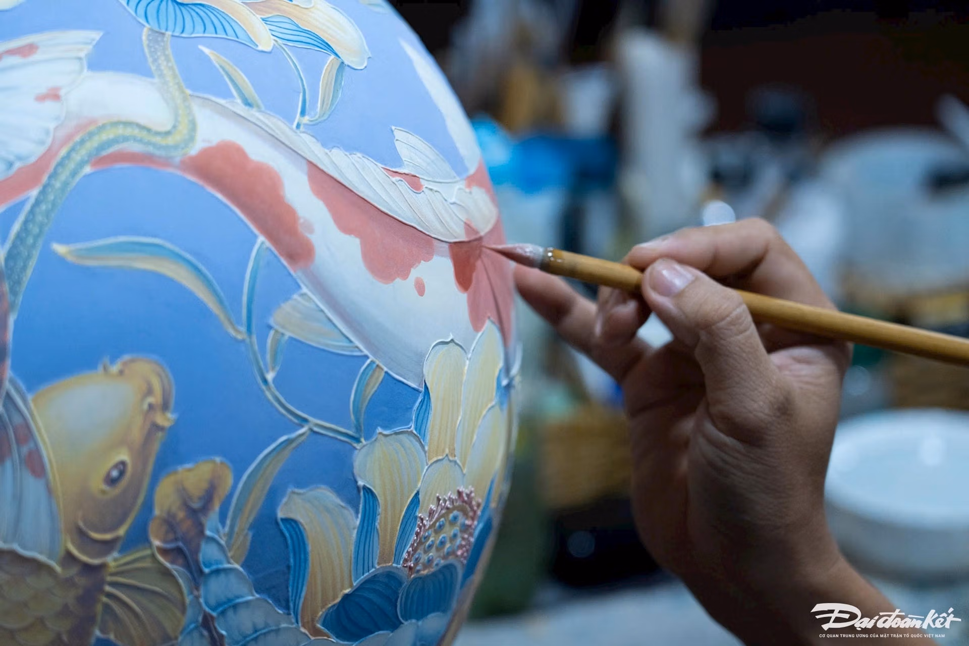 Cũng tại đây, công chúng sẽ được thưởng lãm bức tranh Sơn Hà, dùng hình ảnh linh vật đầu rồng mỏ phượng để biểu đạt vẻ đẹp hùng vĩ đất nước. Kế đến, bức tranh Cẩm Tú, với màu xanh vua (King blue). Đây là màu xanh cực kỳ khó chế tác.