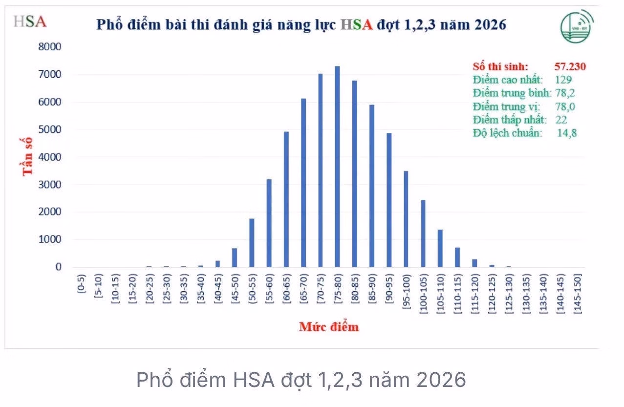 Đại học Quốc gia Hà Nội vừa công bố phổ điểm 3 đợt thi Đánh giá năng lực (HSA) năm 2026. Kết quả, điểm trung bình của hơn 57.200 thí sinh là 78,2/150. Mức điểm này thấp hơn điểm trung bình năm ngoái là 0,6. Điểm cao nhất 3 đợt thi HSA đầu tiên năm 2026 là 129/150, điểm thấp nhất là 22/150.