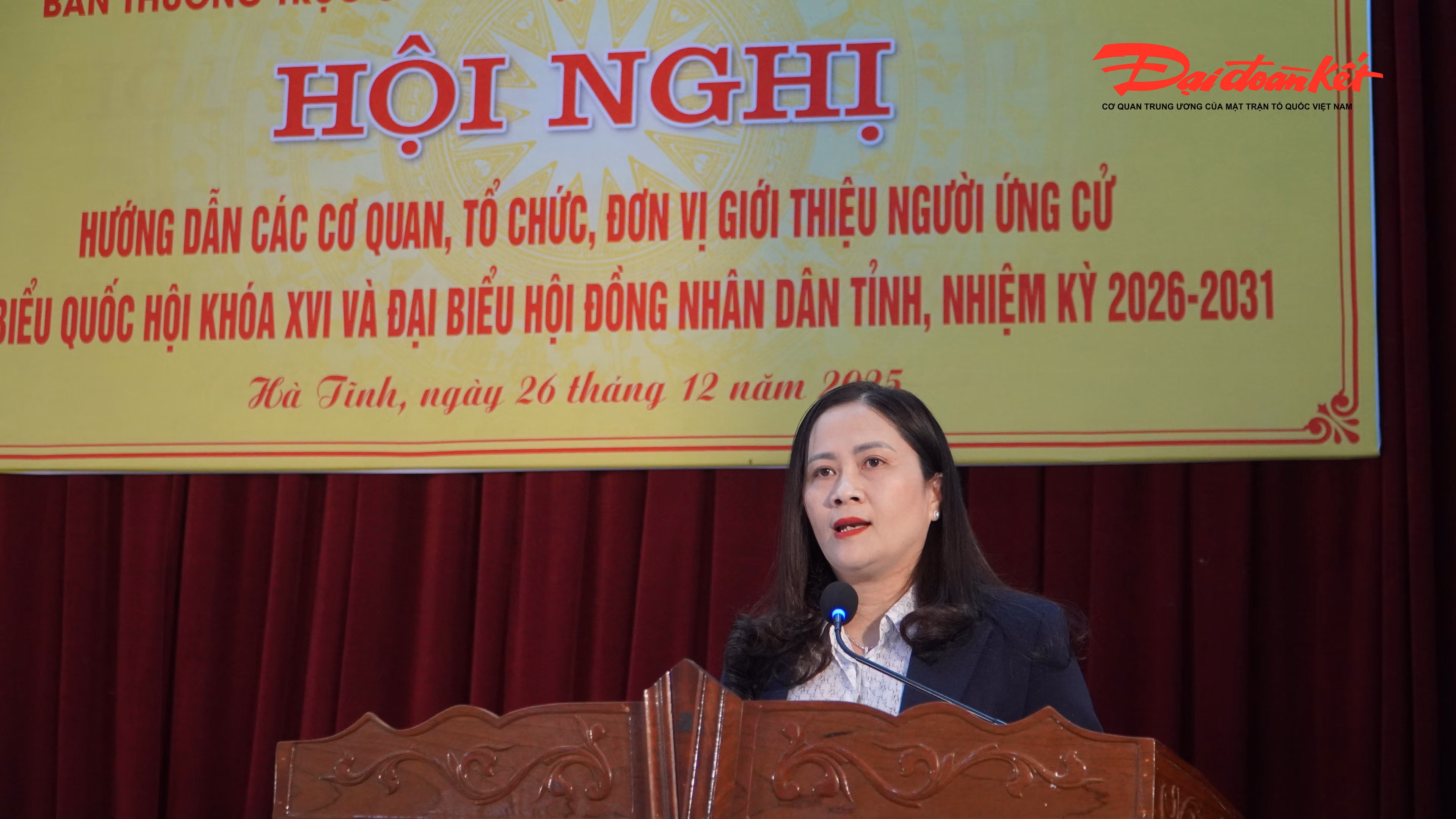 Phó Chủ tịch Ủy ban MTTQ Việt Nam tỉnh Hà Tĩnh Phạm Thị Thu Hà cho biết, số lượng ĐBQH khóa XVI được phân bổ tại tỉnh Hà Tĩnh là 9 đại biểu, trong đó, 3 đại biểu do các cơ quan, tổ chức ở Trung ương giới thiệu và 6 đại biểu do các cơ quan, tổ chức ở địa phương giới thiệu. Dự kiến số lượng người được giới thiệu ứng cử đại biểu HĐND tỉnh Hà Tĩnh khóa XIX, nhiệm kỳ 2026 - 2031 là 58 đại biểu.