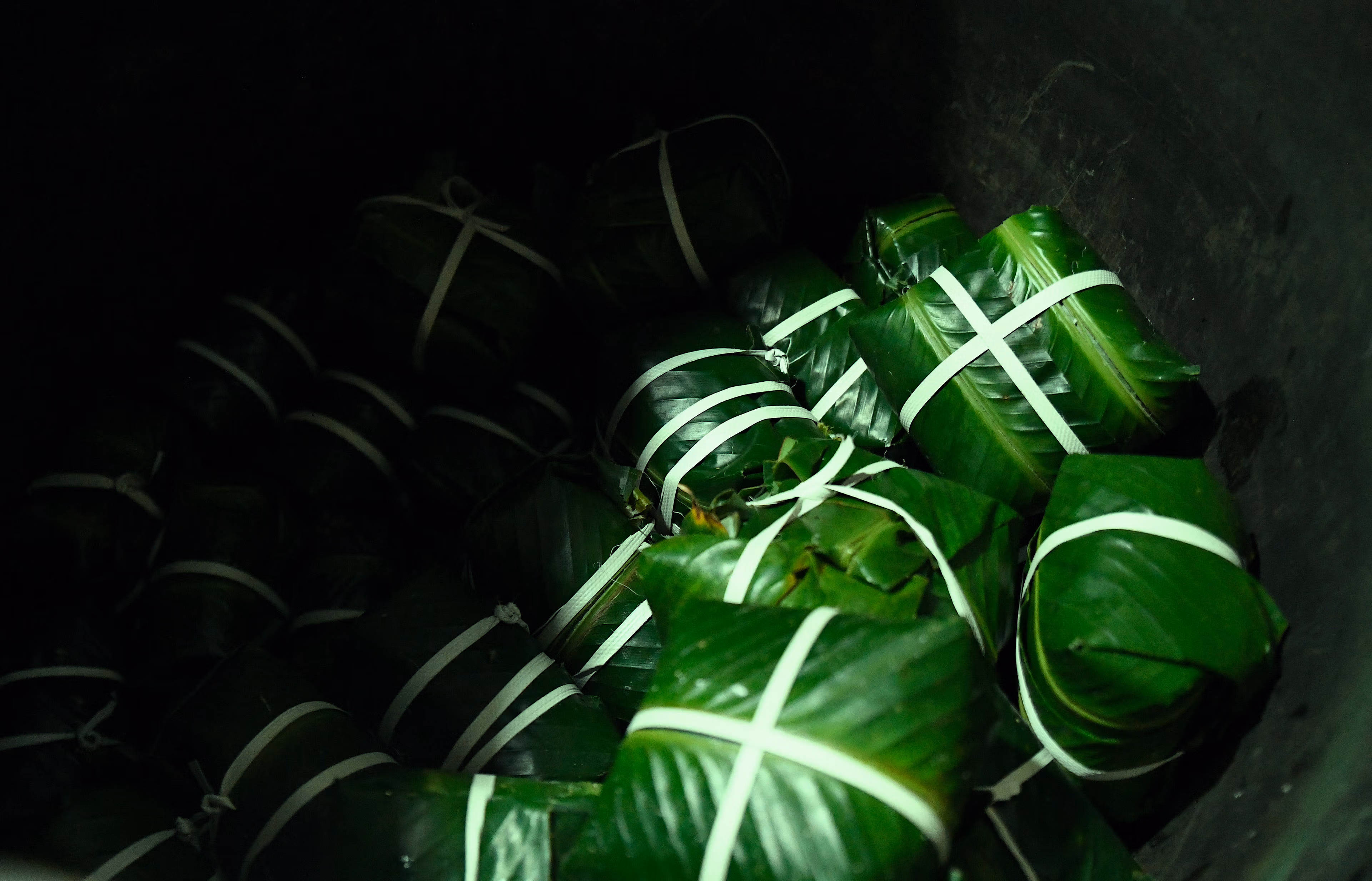 Khi đã hoàn tất các công đoạn và đủ số bánh theo đơn đặt trong ngày, người thợ khéo léo xếp bánh vào nồi, sẵn sàng bước vào công đoạn luộc bánh. Thời gian để luộc một mẻ bánh kéo dài từ 10 - 12 tiếng đồng hồ. Ảnh: Phạm Sỹ.