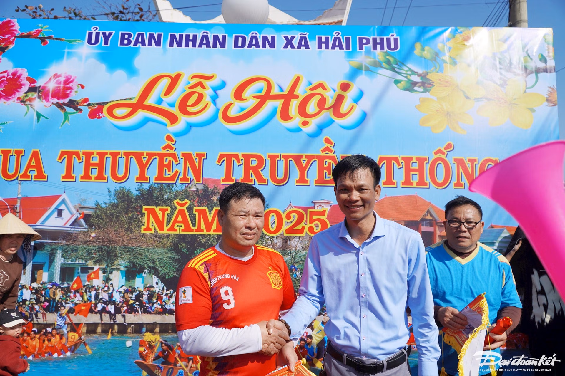 Lễ hội đua thuyền trên sông Lý Hoà ở xã Hải Phú diễn ra hào hứng, sôi nổi. Trên bờ sông có đông người tay vẫy cờ hoa, nón mũ, miệng reo hò cổ vũ… huyên náo cả một vùng sông nước.