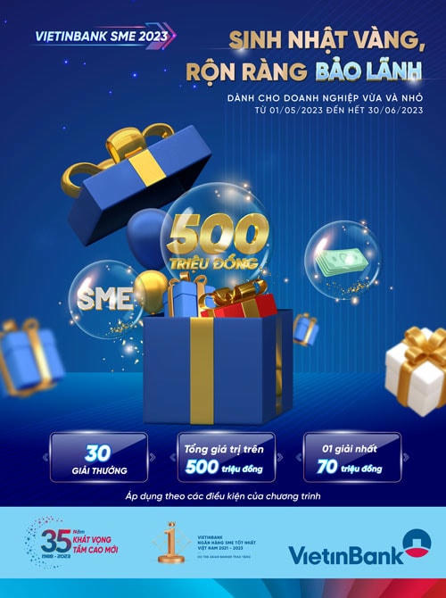 Năm 2023 là một năm đặc biệt trong hành trình phát triển của VietinBank, đánh dấu Ngân hàng chính thức đón sinh nhật lần thứ 35. Để chào mừng sự kiện ý nghĩa này, VietinBank dành tặng tất cả các khách hàng doanh nghiệp sử dụng dịch vụ phát hành bảo lãnh với mức phí từ 10 triệu đồng trở lên, có sử dụng dịch vụ ngân hàng số VietinBank eFAST có cơ hội tham gia Chương trình quay số trúng thưởng “Sinh nhật Vàng, Rộn ràng Bảo lãnh”. Trị giá giải thưởng lên đến hơn 500 triệu đồng.