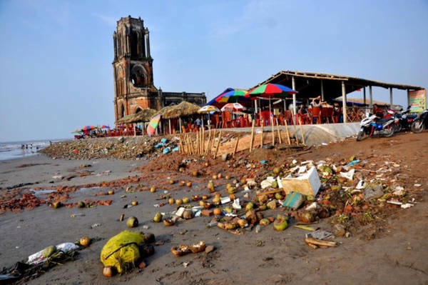 Ngoài nhiều nguy cơ mất an toàn vì gắn liền với một công trình nhà thờ nằm ngay chân sóng, trong tình trạng "sắp đổ" những phần còn lại, ở điểm du lịch tự phát này còn “ghi dấu” về tình trạng rác được xả thải dọc dài bãi biển.