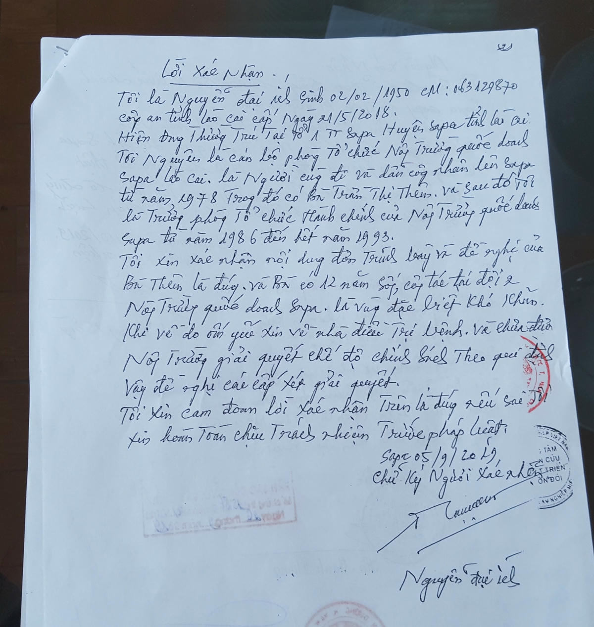 Bà Thêm cho chúng tôi xem tờ giấy xác nhận (đề ngày 5/9/2019) của ông Nguyễn Đại Ích (quê thị trấn Nam Giang, cùng huyện Nam Trực, Nam Định; hiện nghỉ hưu ở thị xã Sa Pa, nguyên là Trưởng phòng Tổ chức - Hành chính của Nông trường Sa Pa từ năm 1986 đến năm 1993).