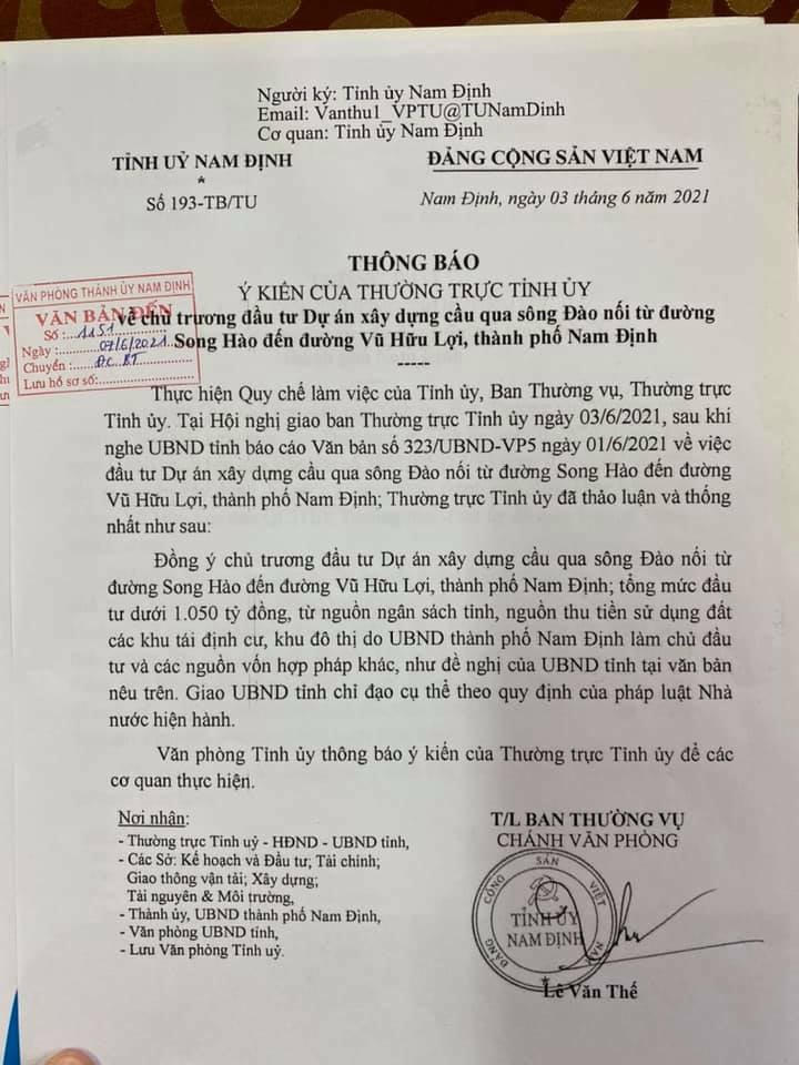 Tối 15/7, thông tin với Đại Đoàn Kết Online, ông Nguyễn Anh Tuấn, Thường vụ Tỉnh ủy Nam Định, Bí thư Thành ủy Nam Định xác nhận mới đây Văn phòng Tỉnh ủy Nam Định đã phát đi thông báo, truyền đạt ý kiến của Thường trực Tỉnh ủy Nam Định về chủ trương đầu tư Dự án cầu qua sông Đào, nối từ đường Song Hào đến đường Vũ Hữu Lợi, TP Nam Định.
