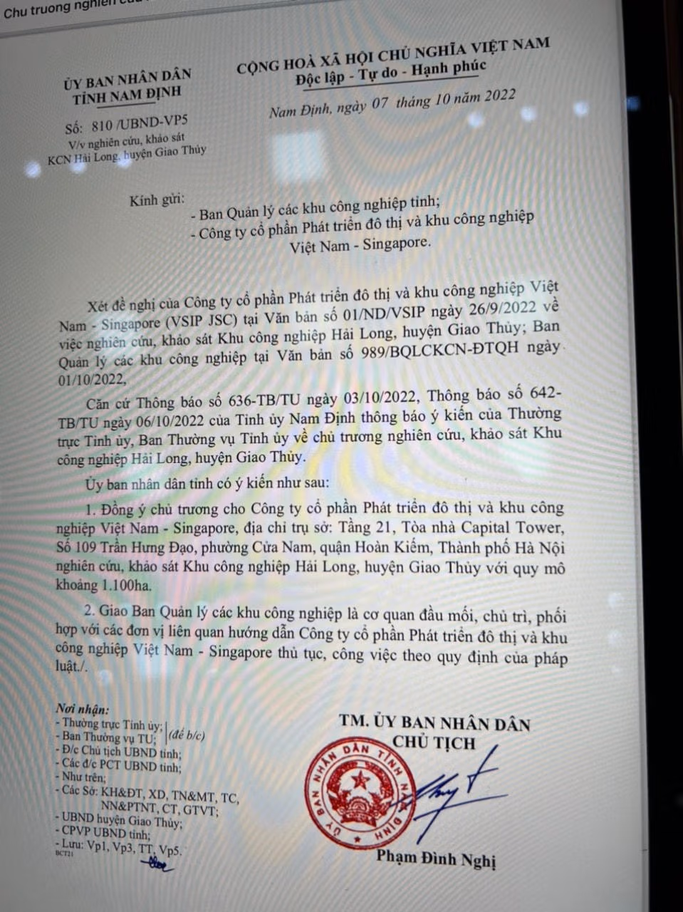 Theo nội dung văn bản, UBND tỉnh Nam Định đồng ý chủ trương cho Công ty CP Phát triển đô thị và khu công nghiệp Việt Nam-Singapore (VSIP JSC), có trụ sở tại Hà Nội nghiên cứu, khảo sát KCN Hải Long, huyện Giao Thủy với quy mô khoảng 1100 ha.