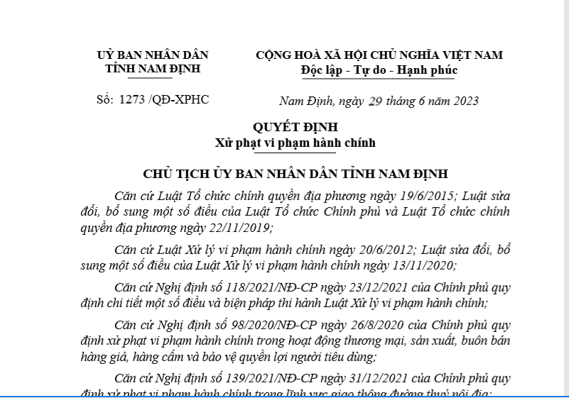 Tại quyết định 1273, Chủ tịch UBND tỉnh Nam Định xử phạt vi phạm hành chính đối với Lê Văn Trung (34 tuổi, ở xã Việt Hùng, huyện Trực Ninh, tỉnh Nam Định) do “không có Giấy chứng nhận đăng ký phương tiện theo quy định, quy định tại điểm e khoản 1 Điều 15 Nghị định số 139/2021/NĐ-CP”; “không có Giấy chứng nhận an toàn kỹ thuật và bảo vệ môi trường phương tiện theo quy định đối với phương tiện có động cơ tổng công suất máy chính trên 15 sức ngựa đến 135 sức ngựa, quy định tại điểm b khoản 6 Điều 15 Nghị định số 139/2021/NĐ-CP”; “không có Giấy chứng nhận khả năng chuyên môn đối với thuyền viên theo quy định phải có Giấy chứng nhận khả năng chuyên môn thuyền trưởng hạng tư, quy định tại điểm a khoản 3 Điều 22 Nghị định số 139/2021/NĐ-CP” và do người này đã “mua hàng hóa là khoáng sản không có nguồn gốc hợp pháp (mua 28,3 m3 cát khai thác trái phép của ông Bùi Văn Doanh), quy định tại khoản 2 Điều 17 Nghị định số 98/2020/NĐ-CP”.