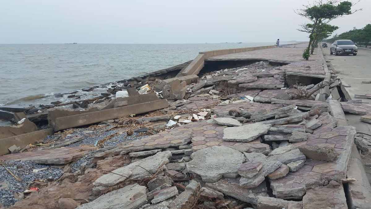 Đoạn thứ nhất, tính từ đầu Đông công trình, chiều dài kè bị sập khoảng hơn 10 m, tổng diện tích bị sập khoảng 60m². Đoạn thứ 2 (cách đoạn thứ nhất khoảng hơn 100m về phía Tây) chiều dài kè bị sập khoảng 5-60 m, tổng diện tích bị sập khoảng 600m². Cụ thể, tường chắn sóng tại đỉnh kè bị sập, gẫy. Đất, đá phần thân kè bị sóng ngoạm, moi, lôi ra biển; tạo thành một cái hố dài, với những chiếc “hàm ếch” sâu hoắm. Toàn bộ phần vỉa hè đường chạy dọc kè và rừng phi lao phòng hộ đoạn chạy qua đây cũng bị sóng đánh sạt, sụt gần hết.