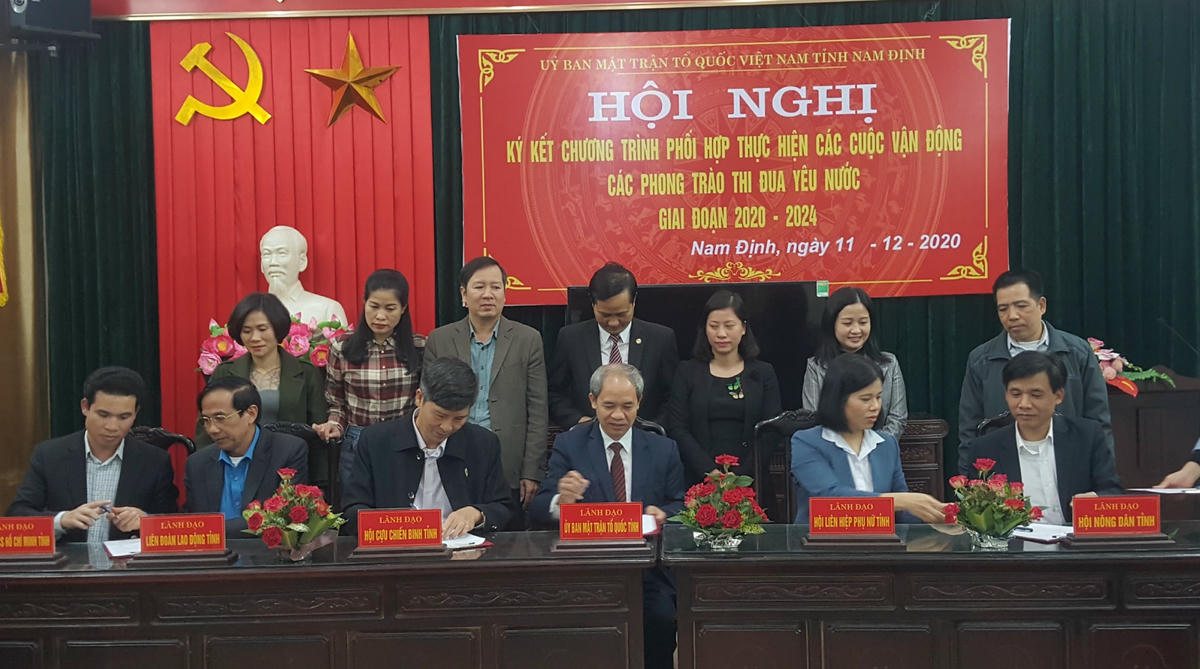 Tại hội nghị, đại diện Ban Thường trực Ủy ban MTTQ Việt Nam tỉnh Nam Định, Hội Nông dân, Hội Phụ nữ, Hội Cựu chiến binh, Liên đoàn Lao động, Đoàn Thanh niên tỉnh đã cùng ký kết thực hiện CVĐ “Toàn dân đoàn kết xây dựng nông thôn mới, đô thị văn minh”; Vận động và thực hiện hỗ trợ người nghèo; CVĐ “Người Việt Nam ưu tiên dùng hàng Việt Nam”; phong trào thi đua “Đoàn kết sáng tạo, nâng cao năng suất, chất lượng, hiệu quả, hội nhập quốc tế” giai đoạn 2020-2024.
