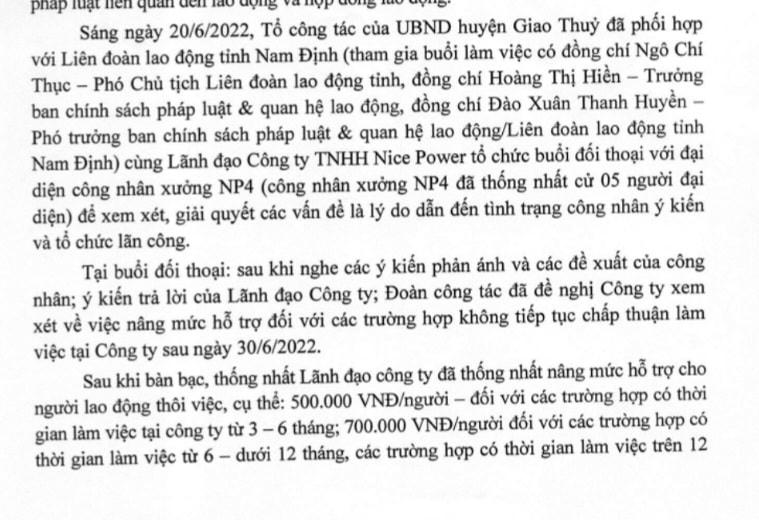 Theo báo cáo của UBND huyện Giao Thủy, đại diện các công nhân đã đồng ý với kết quả cuộc đối thoại.