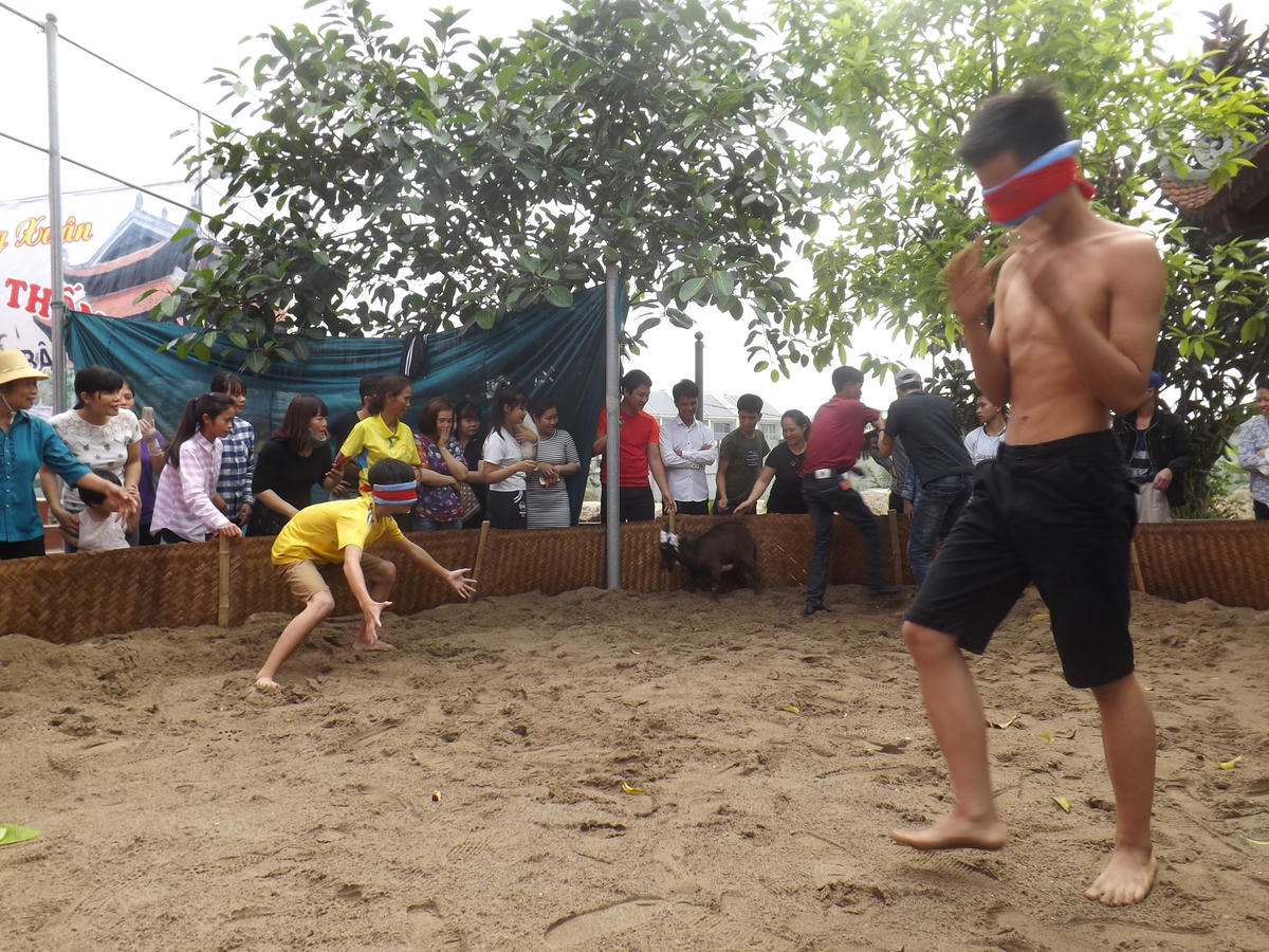 Trên mảnh sân nhỏ đã được rào chắn để dê khỏi chạy mất có mấy cậu thanh niên mắt bịt khăn tối được người xem cổ vũ mách nước đang thử tài tìm bắt con dê chạy vòng quanh, những chàng trai ngỡ đã lâu rồi quên trò vui quê kiểng nay được “chơi” lại bỗng trở nên hào hứng, trở nên hăng hái trổ tài.