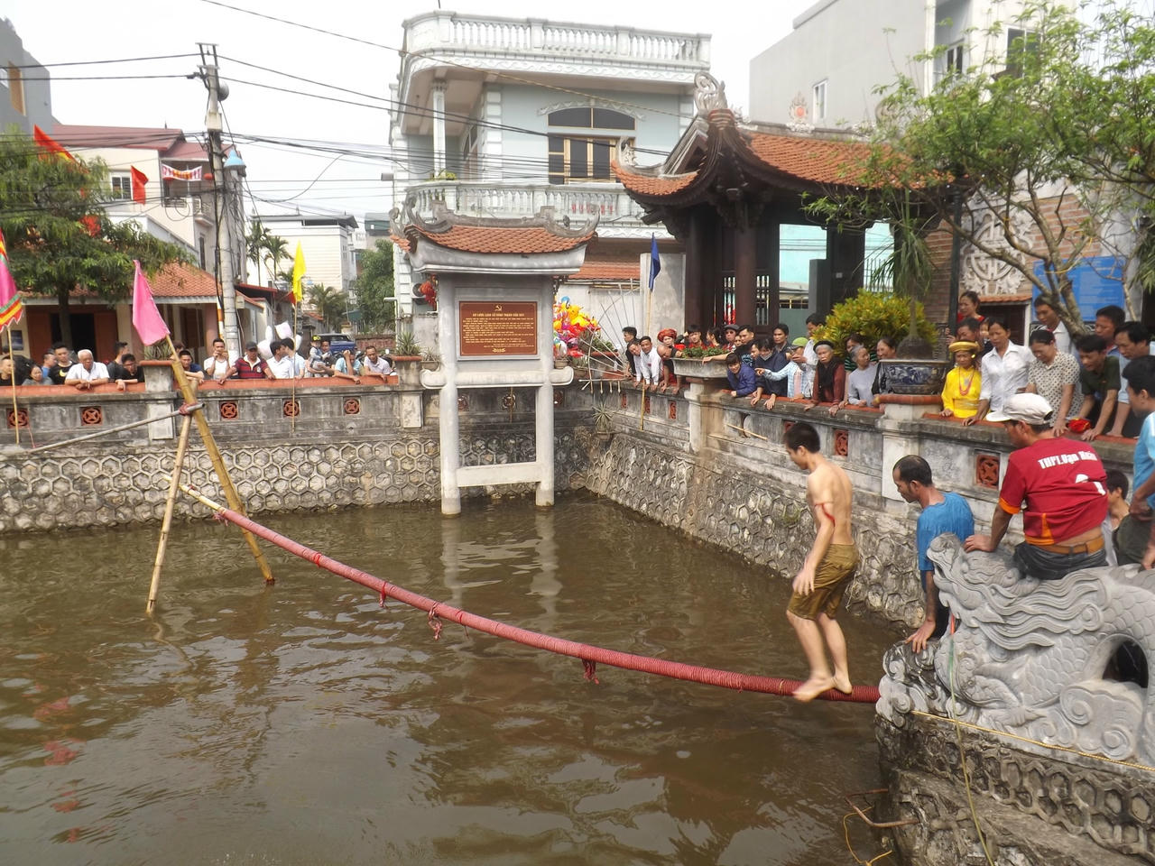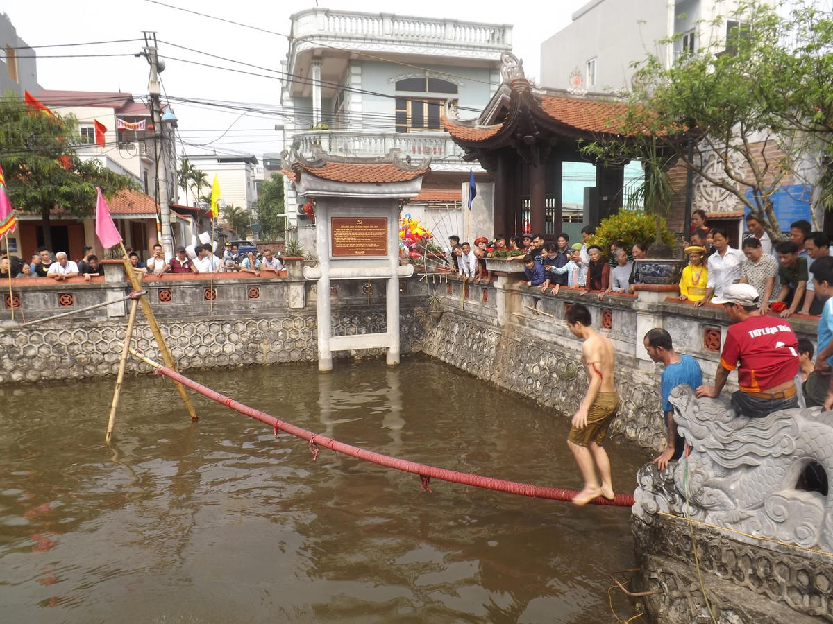 Hội làng đã xong phần lễ, giờ chuyển sang phần hội. Nếu như ở phần lễ là không khí trịnh trọng trang nghiêm thì tới phần hội là một không gian vui chơi náo nhiệt bởi phần hội là sự tái hiện lại những trò chơi dân gian truyền thống, những nét sinh hoạt làm ăn của chính người dân. Tôi thấy đám trai trẻ tóc nhuộm hung hung, mặt trắng tươi hồng như tài tử phim Hàn đang xoay trần chơi trò đi cầu độc mộc. Vui nhất là chẳng có chàng trai nào đi qua được bởi cây cầu đã nhỏ lại bắc ngang giếng đình.