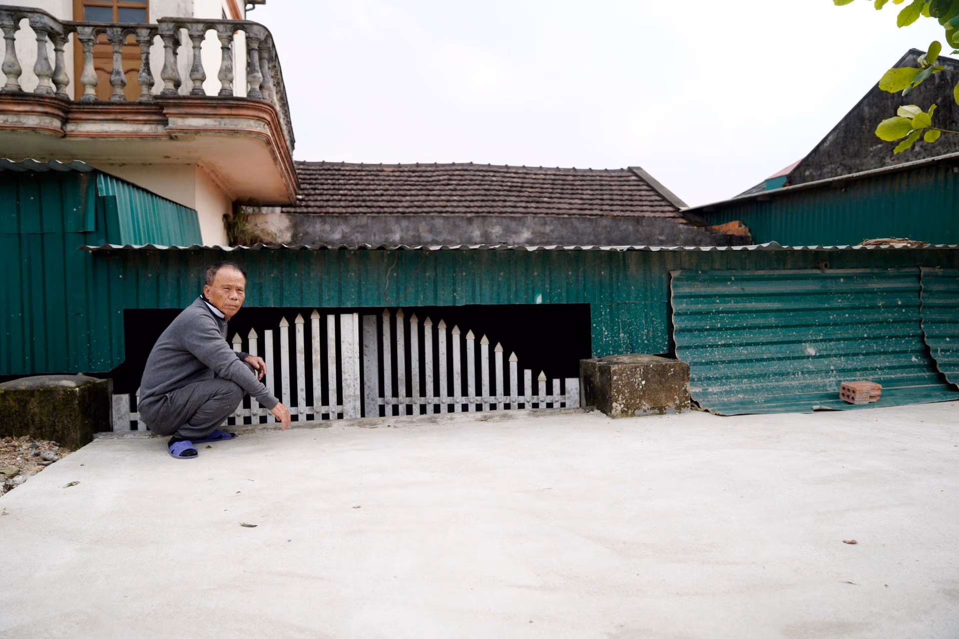 Ông Phan Đình Ngọc (77 tuổi, trú thôn Tân Tiến) - một trong những hộ dân bị ảnh hưởng nặng nhất khi dự án đi qua. Căn nhà 3 gian trên diện tích hơn 200m2 của ông bây giờ không khác gì căn hầm trú ẩn. Toàn bộ ngôi nhà bị mặt đường che kín, cổng chính cũng không thể ra vào được. Để đi lại, gia đình ông phải tự mở một lối ra vào ở bên hông nhà làm bằng cầu thang sắt.