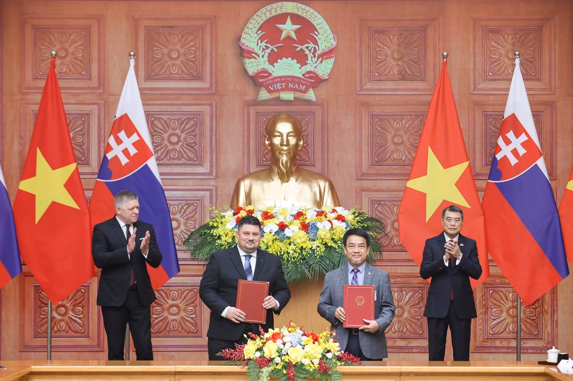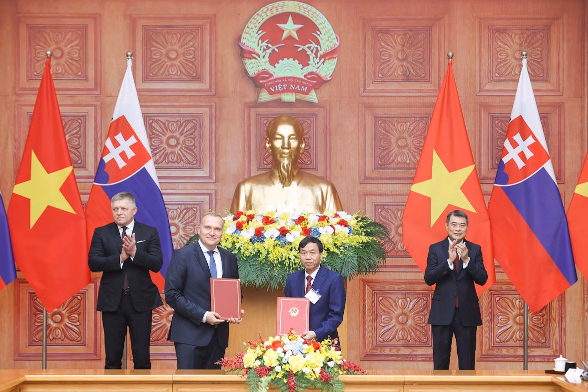 Trước sự chứng kiến của Thủ tướng Chính phủ Lê Minh Hưng và Thủ tướng Slovakia Robert Fico, các bộ, ngành, cơ quan, địa phương hai nước trao 6 văn kiện hợp tác giữa hai nước trong các lĩnh vực chính trị, ngoại giao, quốc phòng, văn hóa, năng lượng nguyên tử...